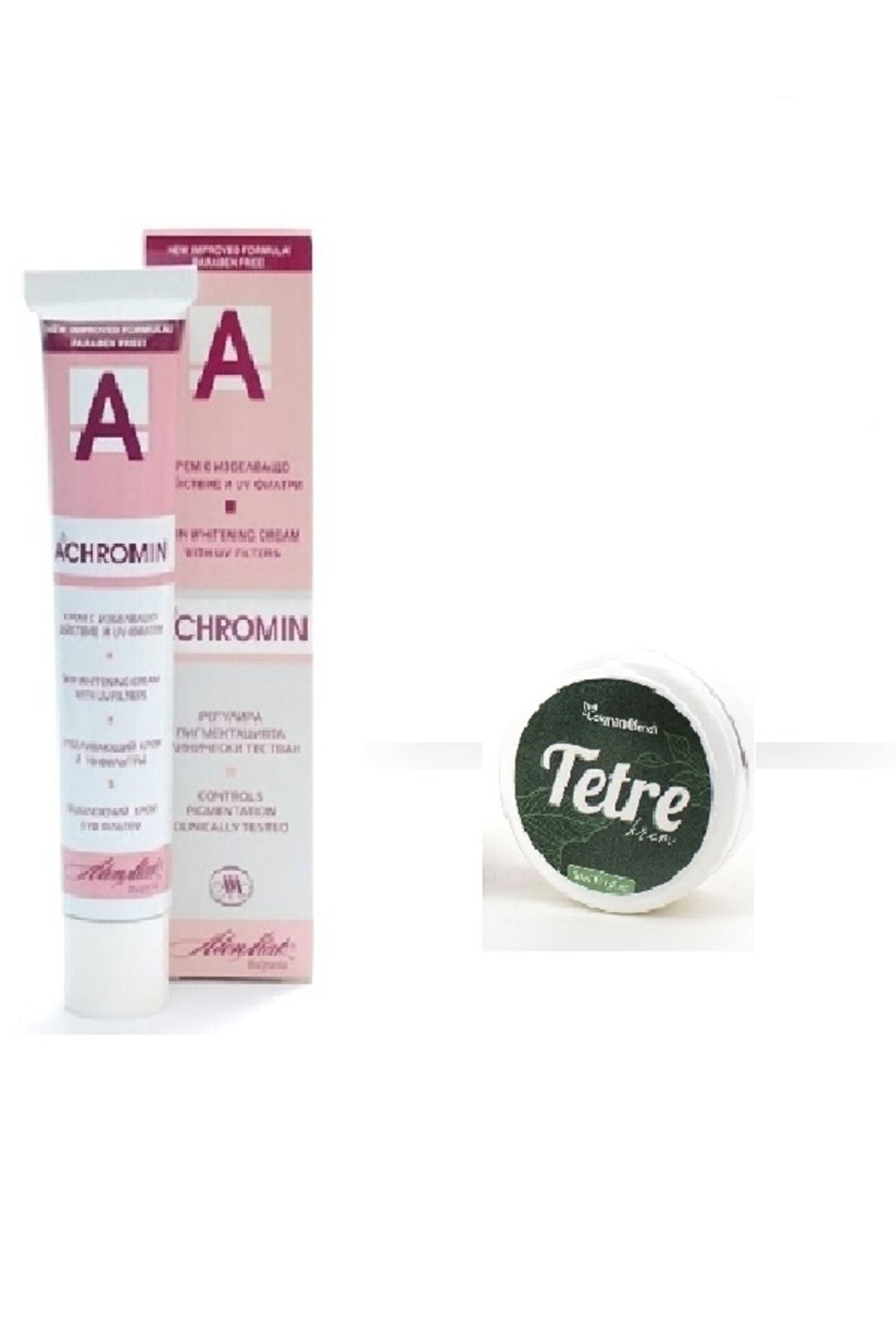 ACHROMİN LEKE KREMİ VE TETRE CİLT ONARICI KREM TETRE KREM Ürün Miktarı: 30 ml Kullanım Şekli: Temiz ve kurumuş cilde, ince bir tabaka halinde uygulanır. ; Sık kullanıma uygundur. ; Ürün Faydaları: El, yüz ve vücut için uygundur. ; Cildin sahip olduğu bariyer fonksiyonunu korumaya yardımcı olur. ; Tüm cilt tiplerinde günlük kullanıma uygundur. ; Ürün İçeriği: Aqua, Cetearyl Alcohol, Glyceryl Stearate, Cotinus Coggygria Branch/Leaf Oil(Tetre Yağı), Butyrospermum Parkii Butter, Glycerin, Peg-100 Stearate, Propylene Glycol, Momordica Charantia Extract(Kudret Narı Özü), Calendula Officinalis Flower Oil(Aynısafa Yağı), Hypericum Perforatum Oil(Kantaron Yağı), Cocos Nucifera Oil(Hindistan Cevizi Yağı), Chamomilla Recutita Flower Extract(Papatya Özü), Tocopheryl Acetate(Vitamin E), Carbomer, Xanthan Gum, Phenoxyethanol, Ethylhexylglycerin, Parfum, Sodium Hydroxide, EDTA. ; Uyarılar: Haricen kullanılır. ; Göz ile temas ettirmeyiniz, temas halinde bol su ile yıkayınız. ; Çocukların ulaşamayacağı yerlerde muhafaza ediniz. ; Kullanım öncesi bilek içi testi yapınız. ; İçinde yer alan herhangi bir hammaddeye alerjiniz varsa kullanmayınız. ; ACHROMIN KREM ÜRETİM TARİHTEN İTİBAREN 3 YILDIR. ; DETAYLI BİLGİ İÇİN ÜRÜNÜN YAN TARAFINA BAKINIZ. ; Achromin leke kremi : Tüp altında yazan tarihten itibaren 36 ay (3 yıl) dır. ; Açıklama kutu yan kısmında yazmaktadır. ; .. ; Rus ve Bulgarlar tarafından Rusya, Bulgaristan gibi ülkelerde çok yaygın olarak kullanılmaktadır ve ürünün memnuniyet oranı çok yüksektir. ; Cilde Parlaklık, Beyazlık kazandırır ve nemlendirir. ; Cilt tonu eşitsizliğini düzenlenmeye yardımcı olur. ; Leke karşıtı içeriği sayesinde farklı özellikteki tüm koyu lekelerin ve renk düzensizliklerinin görünümünü düzeltmeye yardımcı olur. ; Tüm cilt tipleri ve yaş grubu için uygundur. ; Yüz ve vücudun her bölgesinde kullanıma uygundur. ; Sabah ve akşam, göz çevresi hariç, temiz cilde dairesel hareketlerle uygulanır. ; En iyi sonuç için 28 günlük düzenli kullanım önerilir. ; Alerji testi için bir miktar ACHROMIN krem bilek kısmına sürülür, 3-4 saat beklenir ve alerjik belirtiler var ise kullanılmamalıdır.;