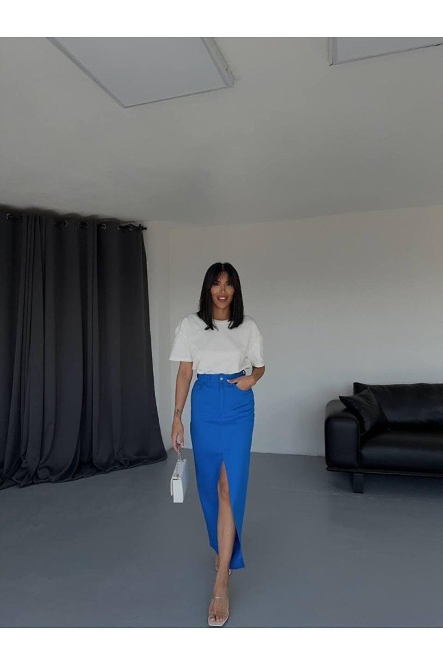 GABARDİN UZUN ÖNDEN YIRTMAÇLI ETEK - Saks