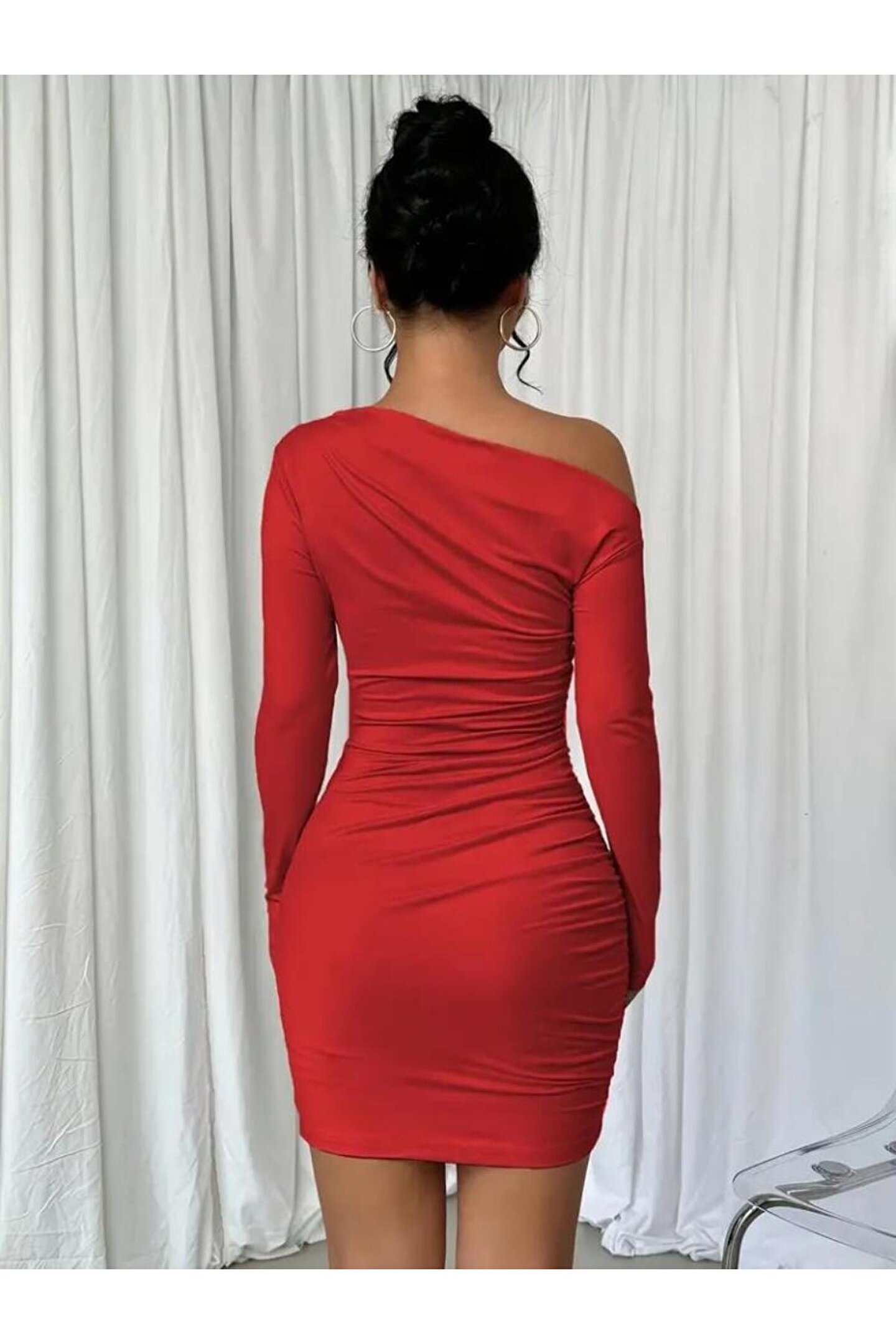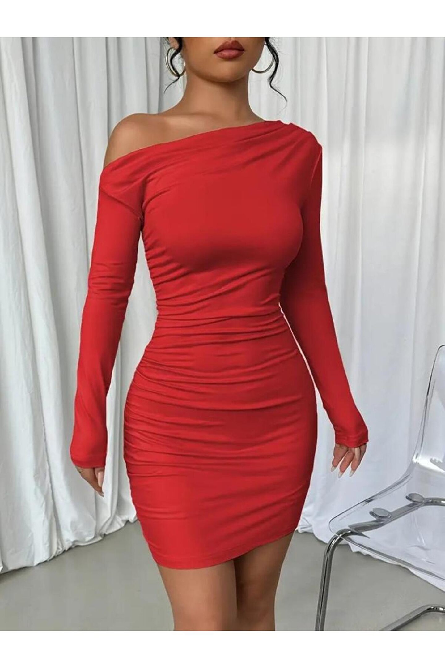 Adora Moda Kadın Uzun Kollu Tek Omuzu Açık Yanlardan Büzgülü Kısa Sandy Elbise