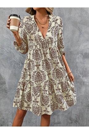 Adora Moda Kadın Uzun Kollu V Yakalı Fırfırlı Mini Süprem Elbise