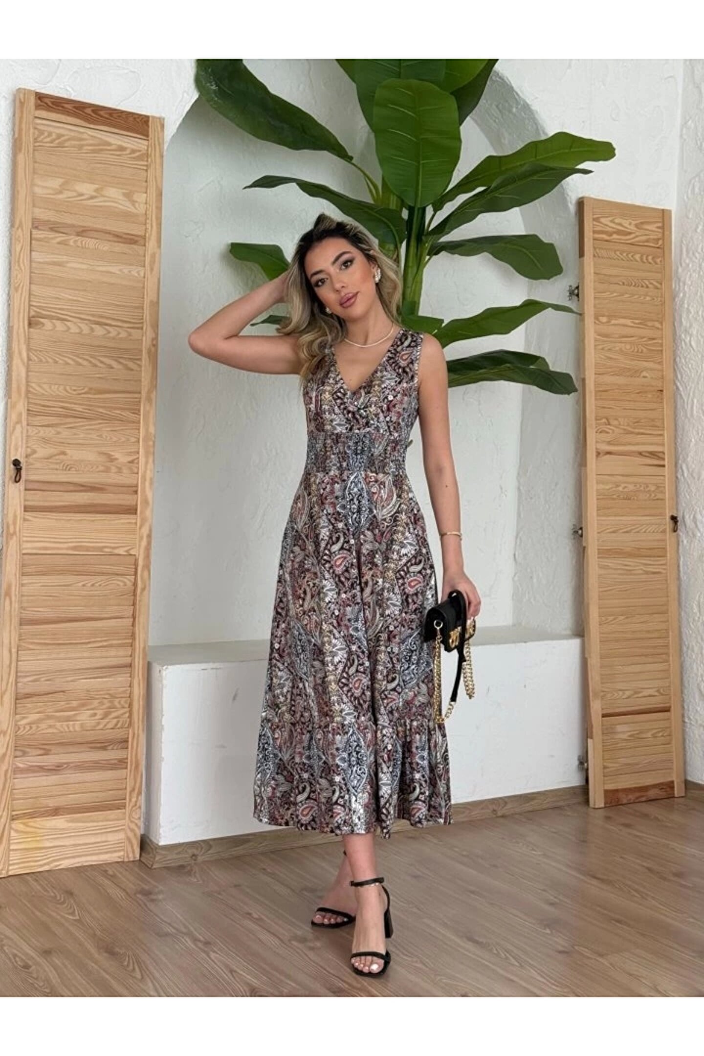Kadın Beli Gipeli Etnik Desen Sıfır Kol Süprem Elbise