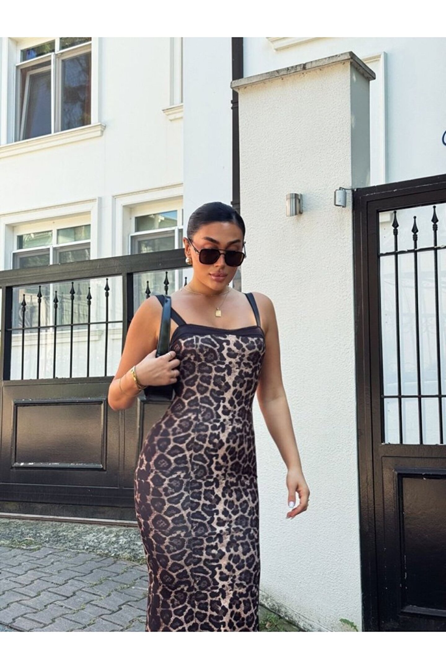 Kadın Dalgıç Kumaş Dijital Leopar Baskılı Midi Boy Elbise