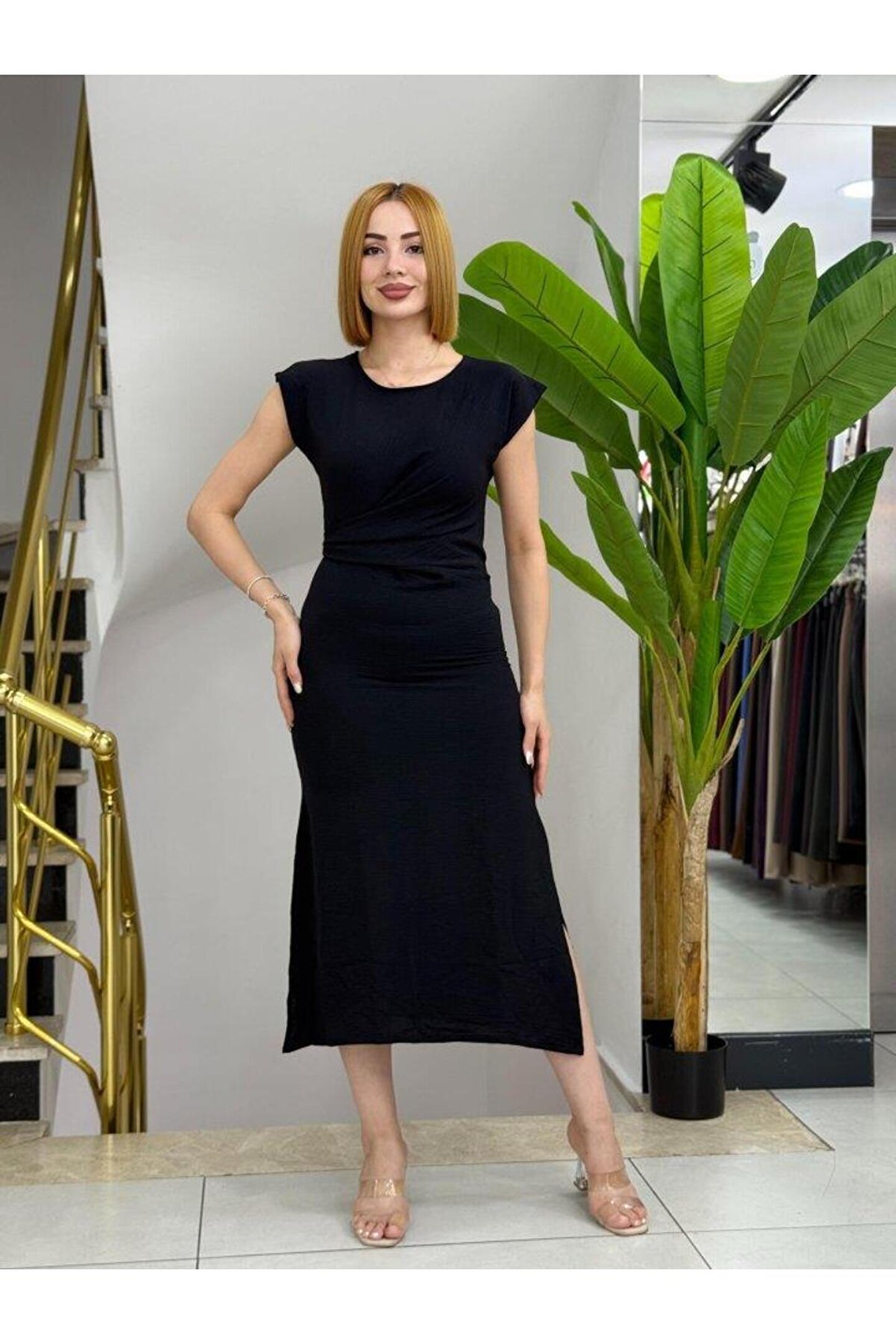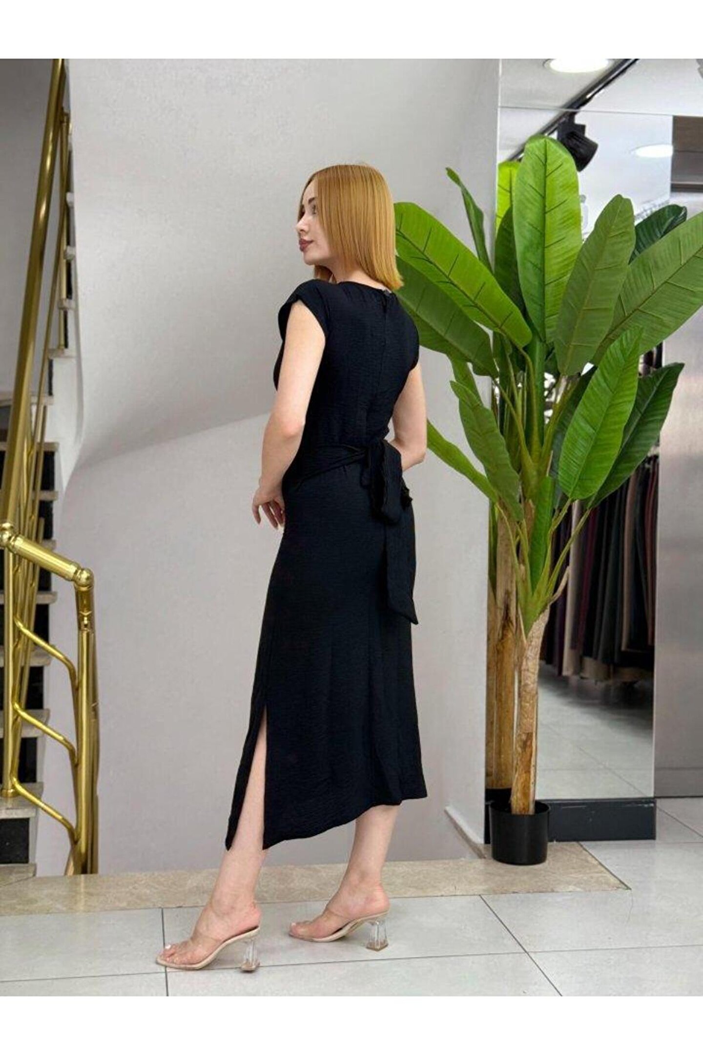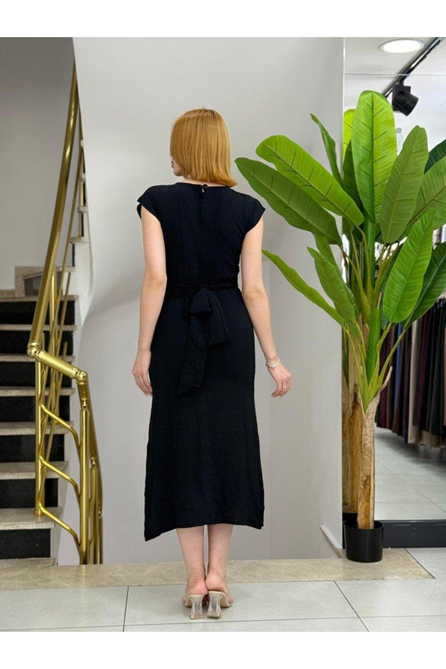 Kadın Kısa Kollu Yuvarlak Yaka Belden Bağcıklı önden Yırtmaçlı Aerobin Elbise