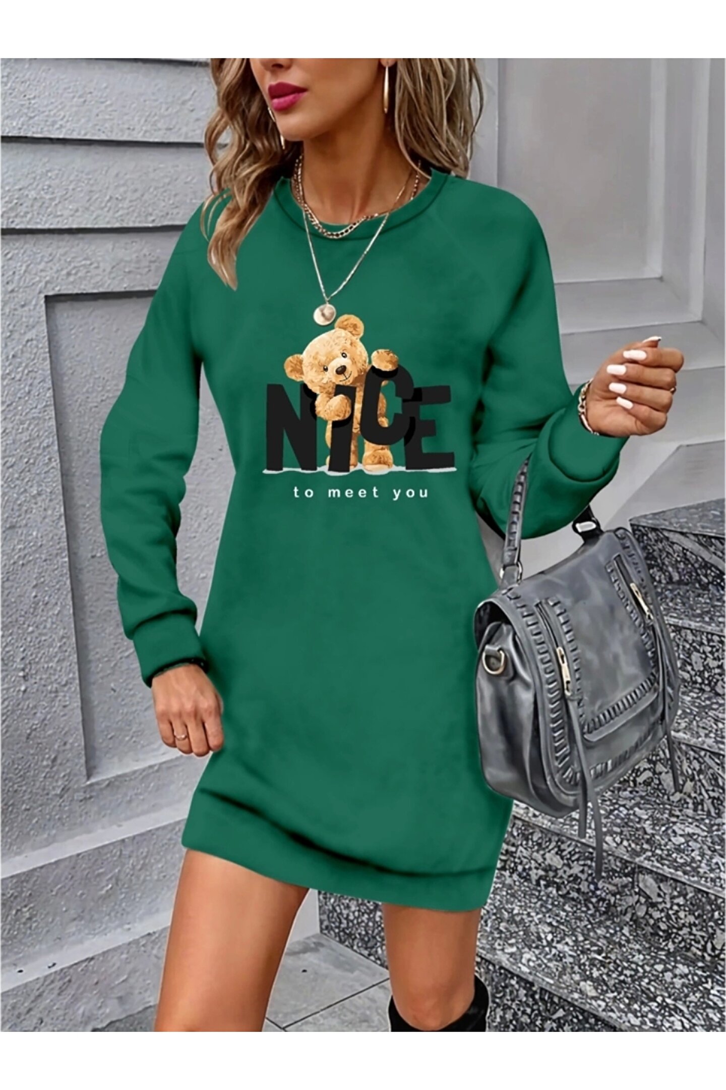 Kadın Uzun Kollu Bisiklet Yaka Ayı Desenli Viskon Iki Iplik Elbise