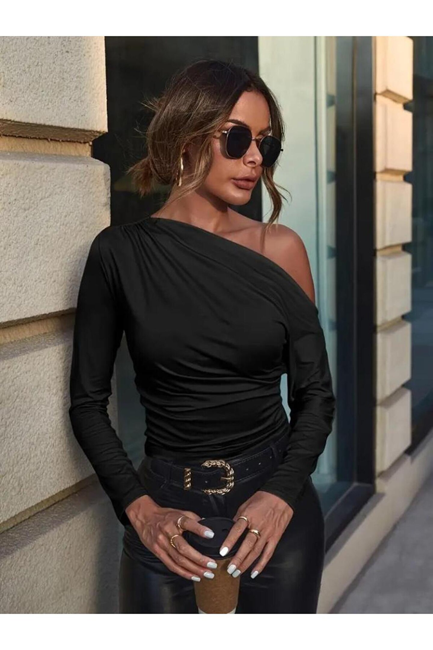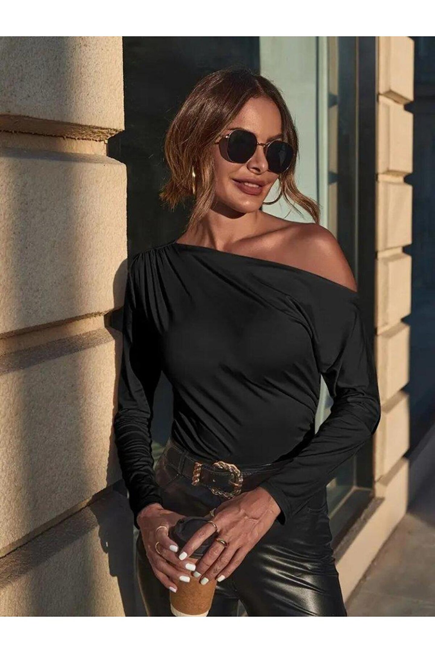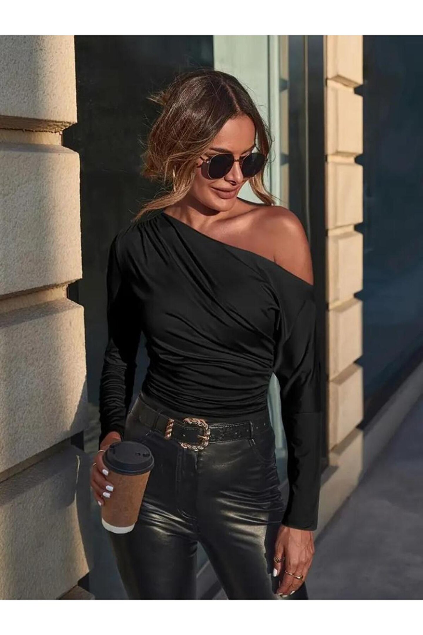 Kadın Uzun Kollu Tek Omuzu Açık Büzgü Detaylı Sandy Bluz