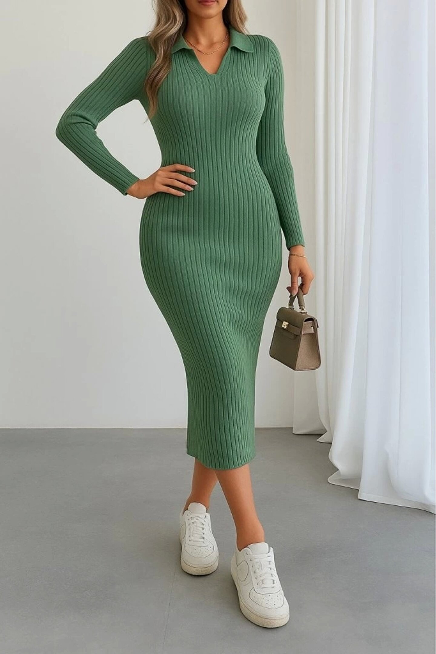 Kadın Uzun Kollu Yakalı Triko Elbise