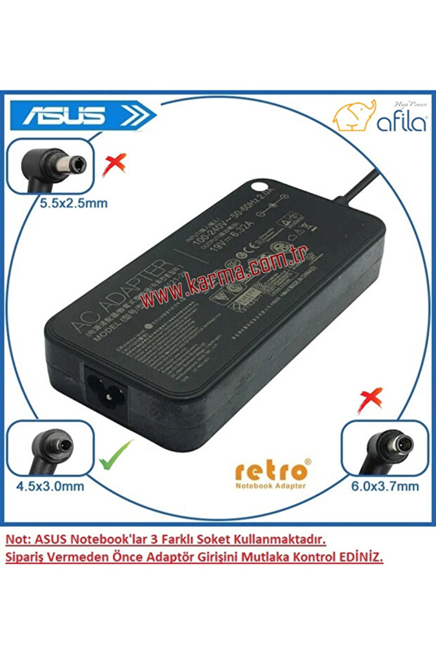 Afila Asus FX505DV-AL128 Notebook uyumlu Adaptör, Şarj Cihazı 150W (4.5mm)