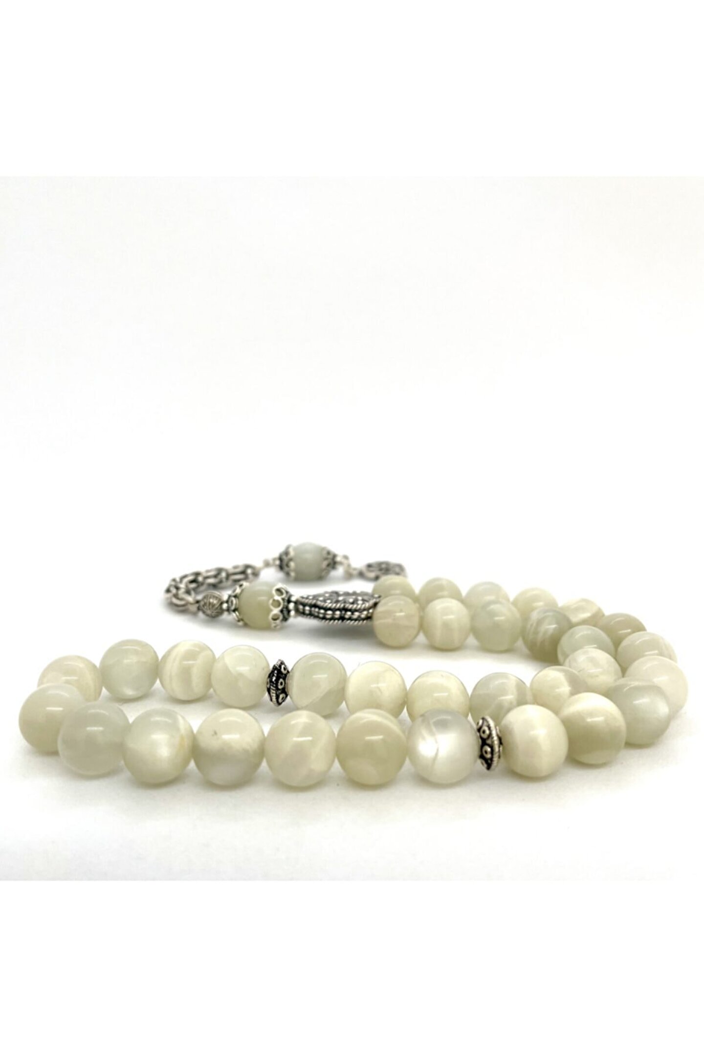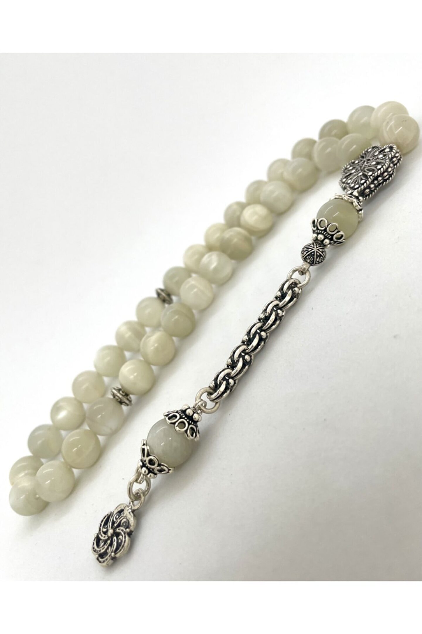 Gümüş kaplama malzemesiyle üretilmiş, uzun ömürlü ve şık bir görünüm sunar; Doğal aytaşı taşı, her bir tesbih tanesi benzersiz desen ve renklerle süslenmiştir, bu da her kullanımda farklı bir deneyim sağlar; Geleneksel el işçiliği ile üretilmiş olup, hem estetik hem de kalite açısından öne çıkar;