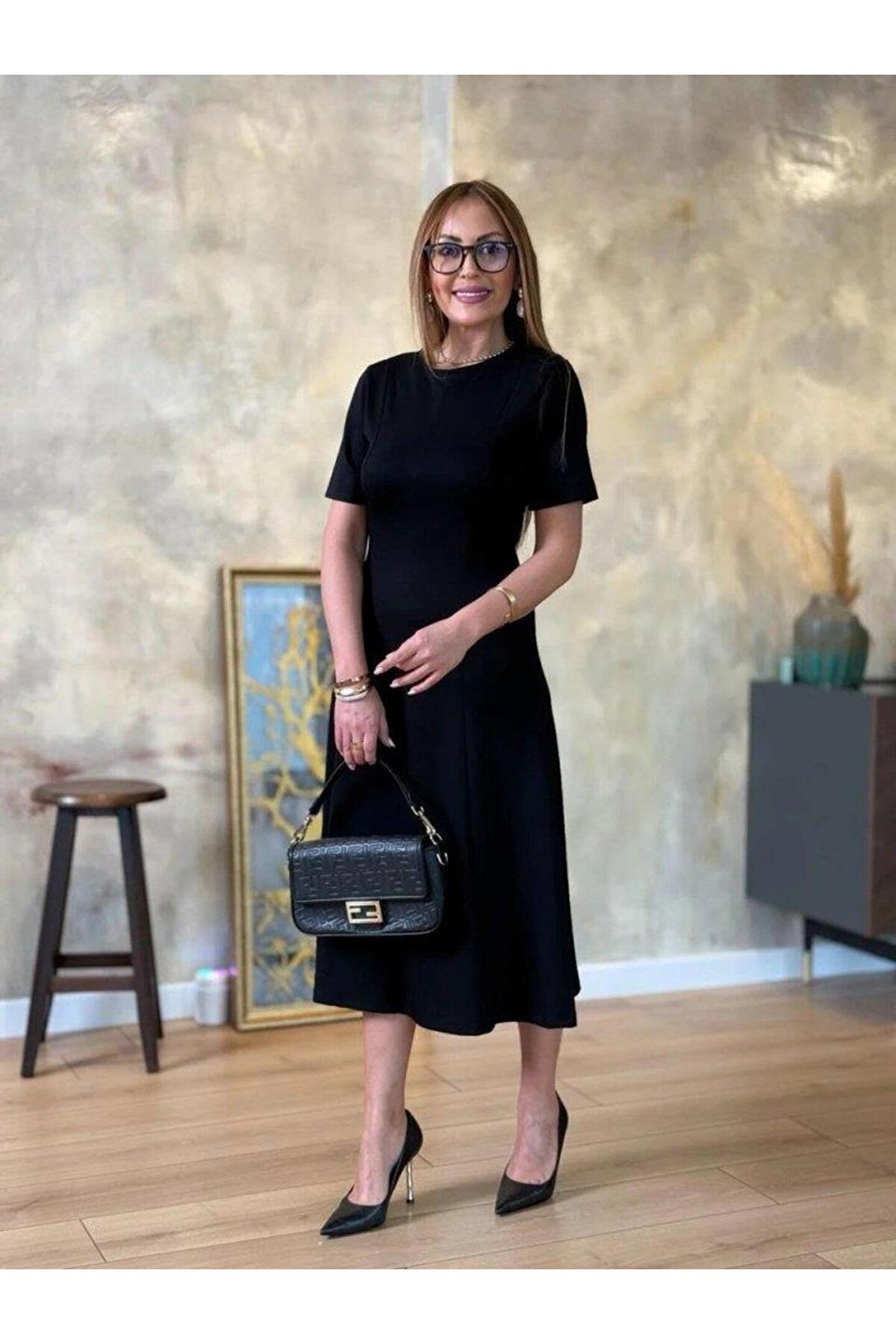 AhEs Shopping Kadın Kısa Kollu Bisiklet Yaka Midi Viskon Iki Iplik Elbise