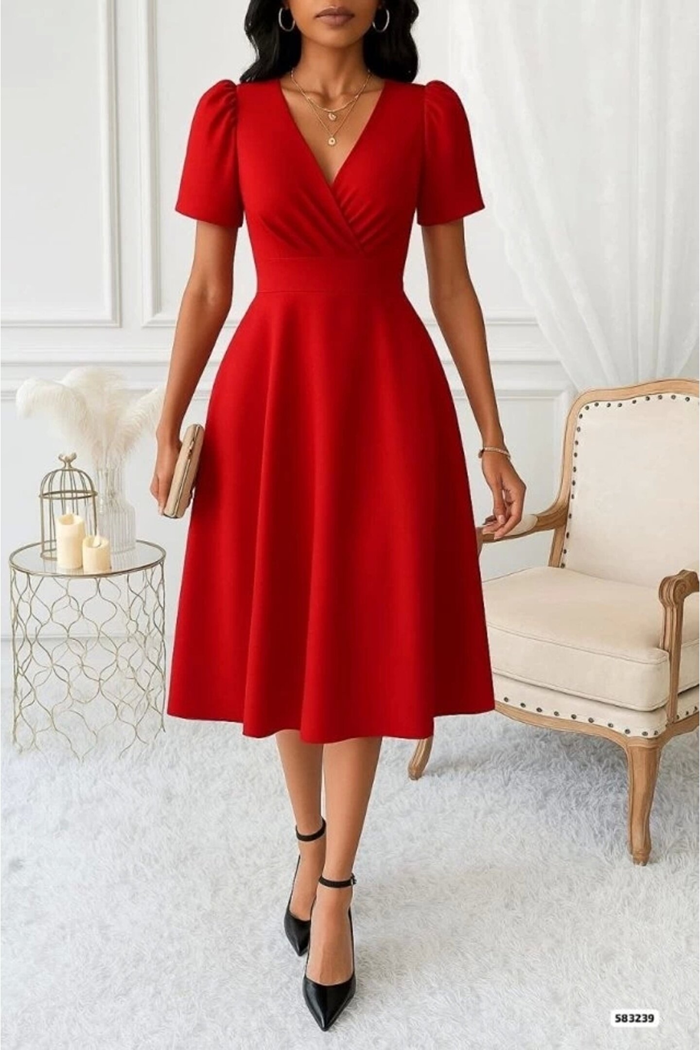 AhEs Shopping Kadın Kruvaze Yaka Kısa Kollu Midi Boy Krep Kumaş Elbise