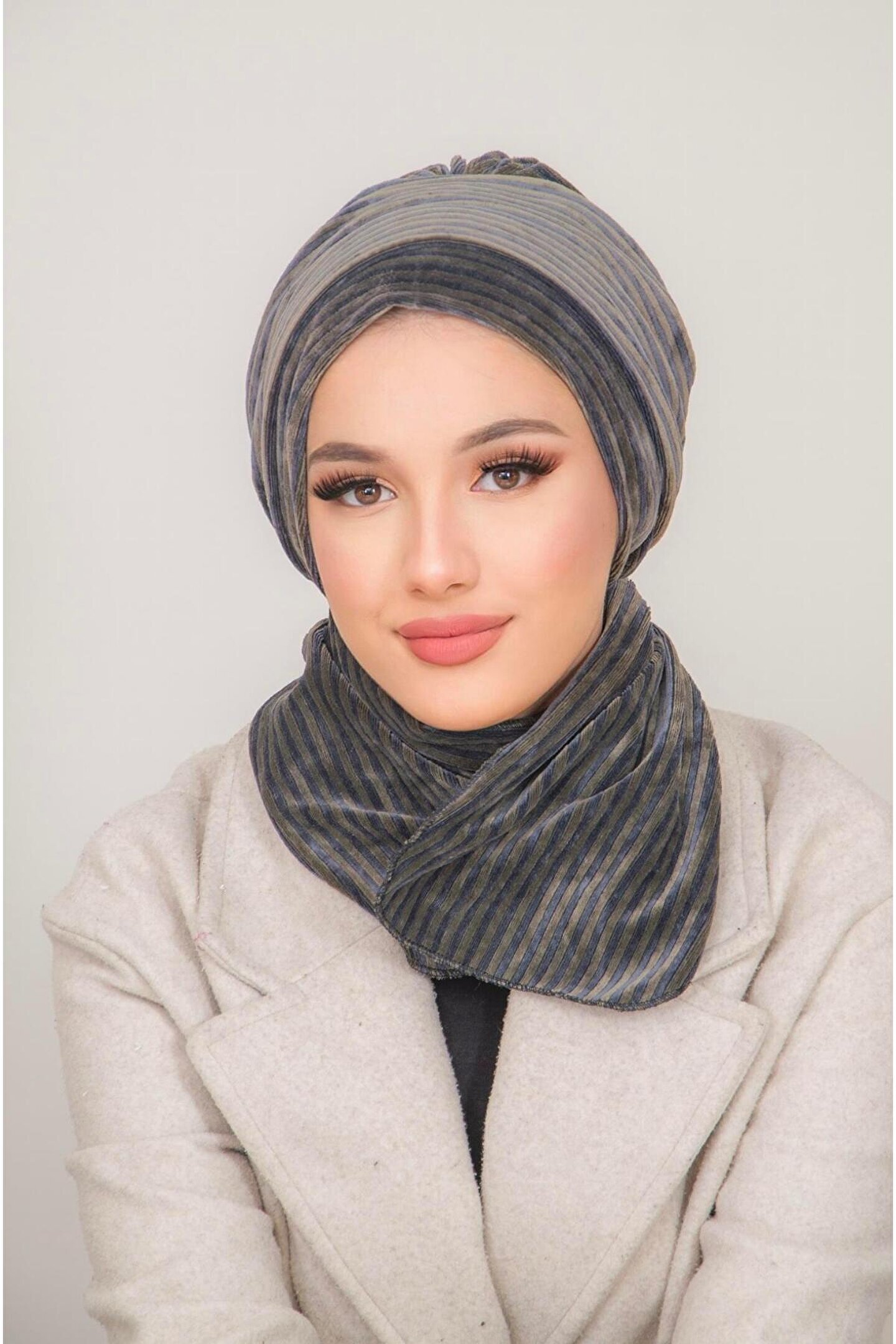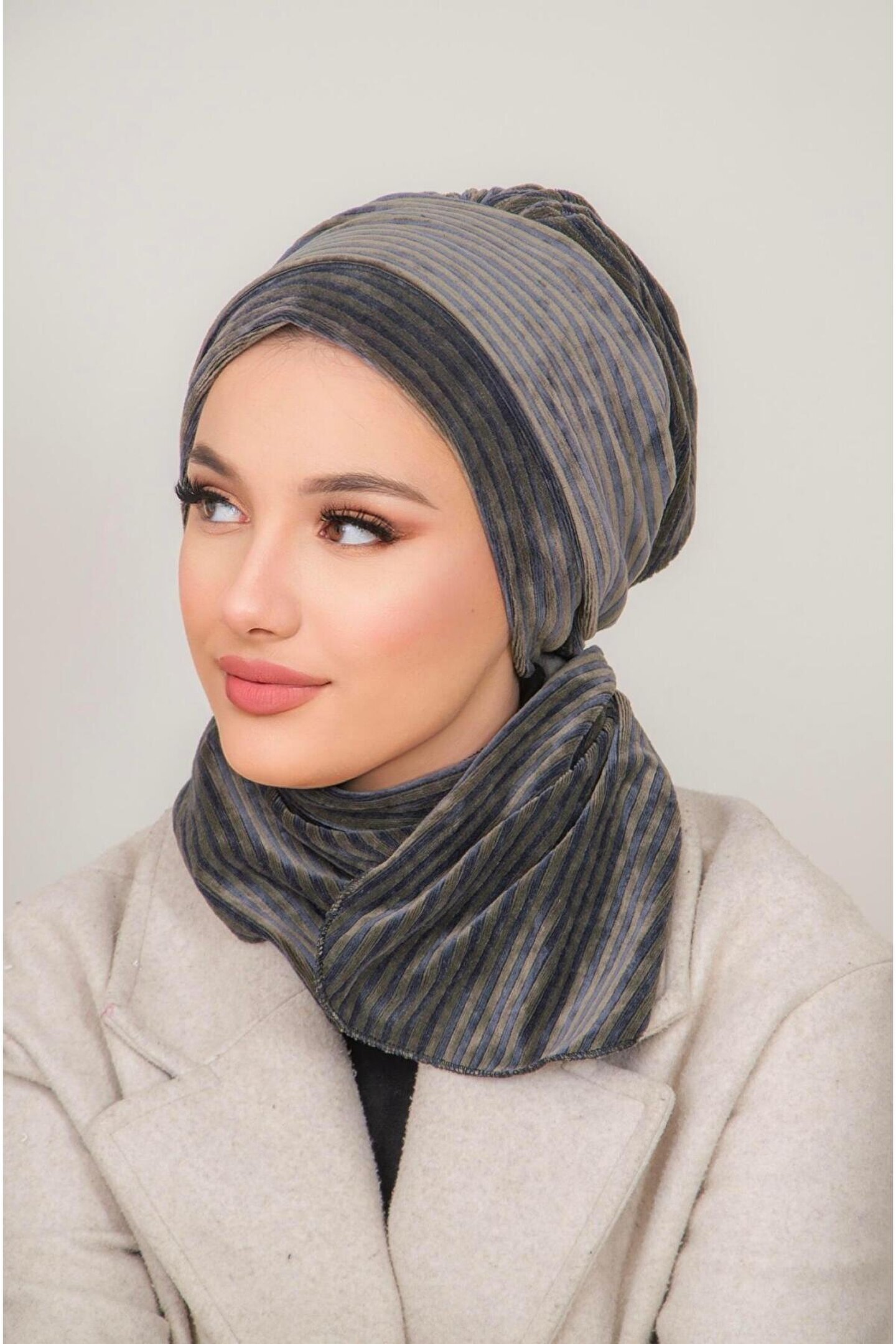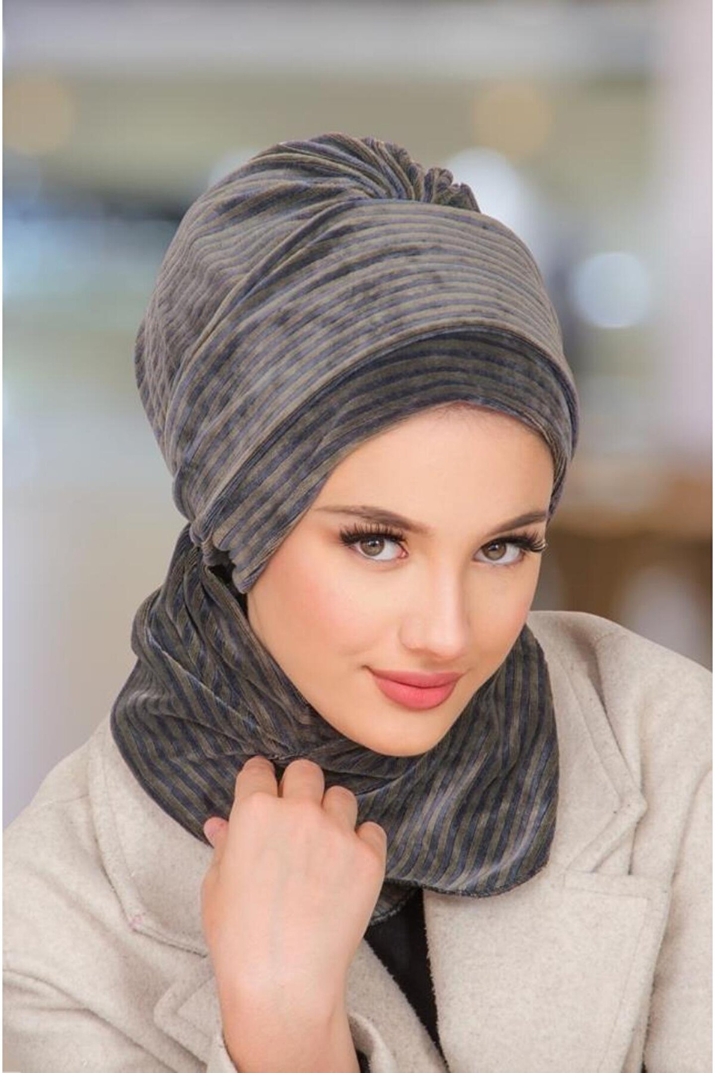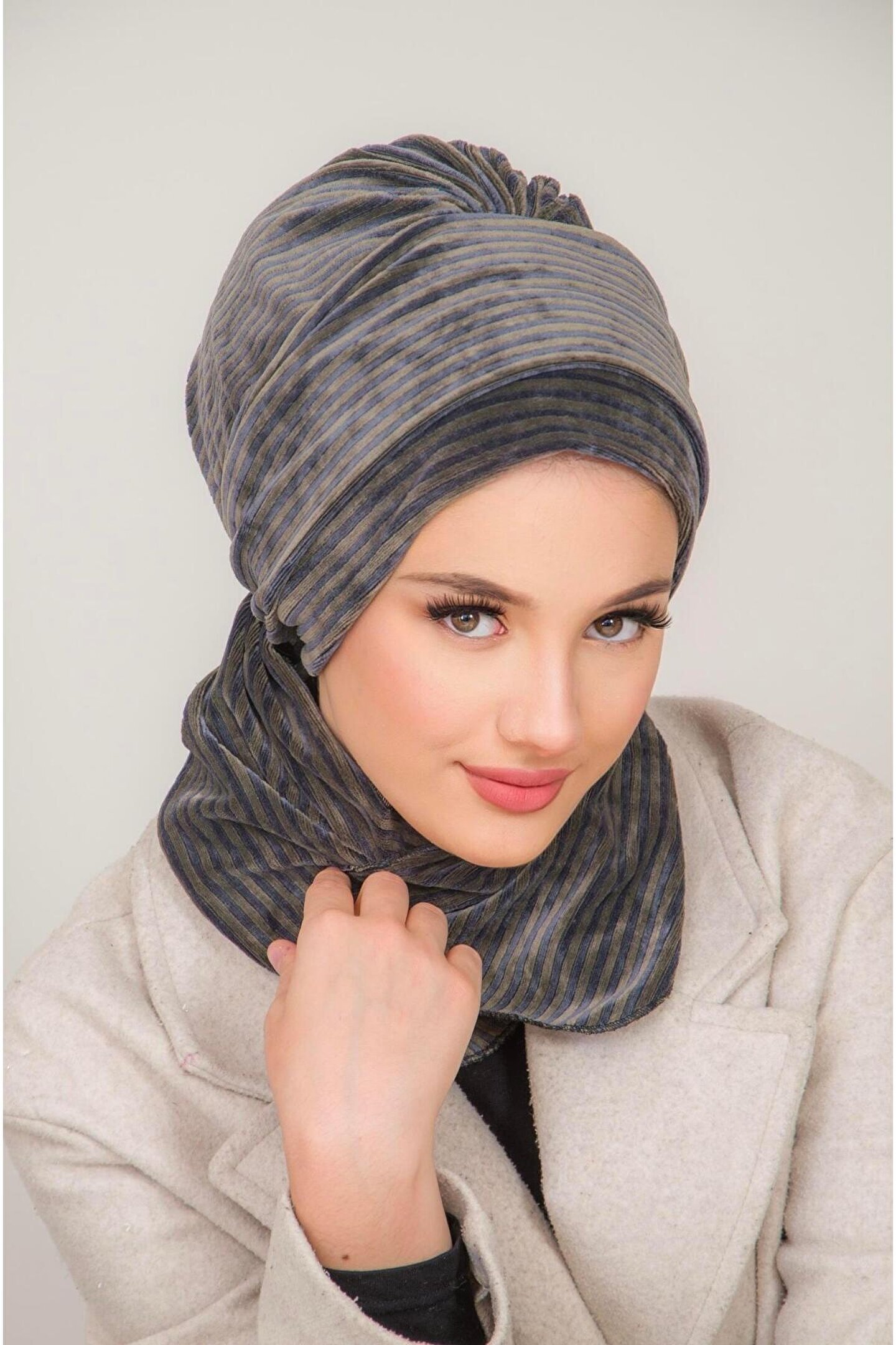 Aişe tesettür Antrasit Çizgili Kadife Atkılı Tesettür Bone
