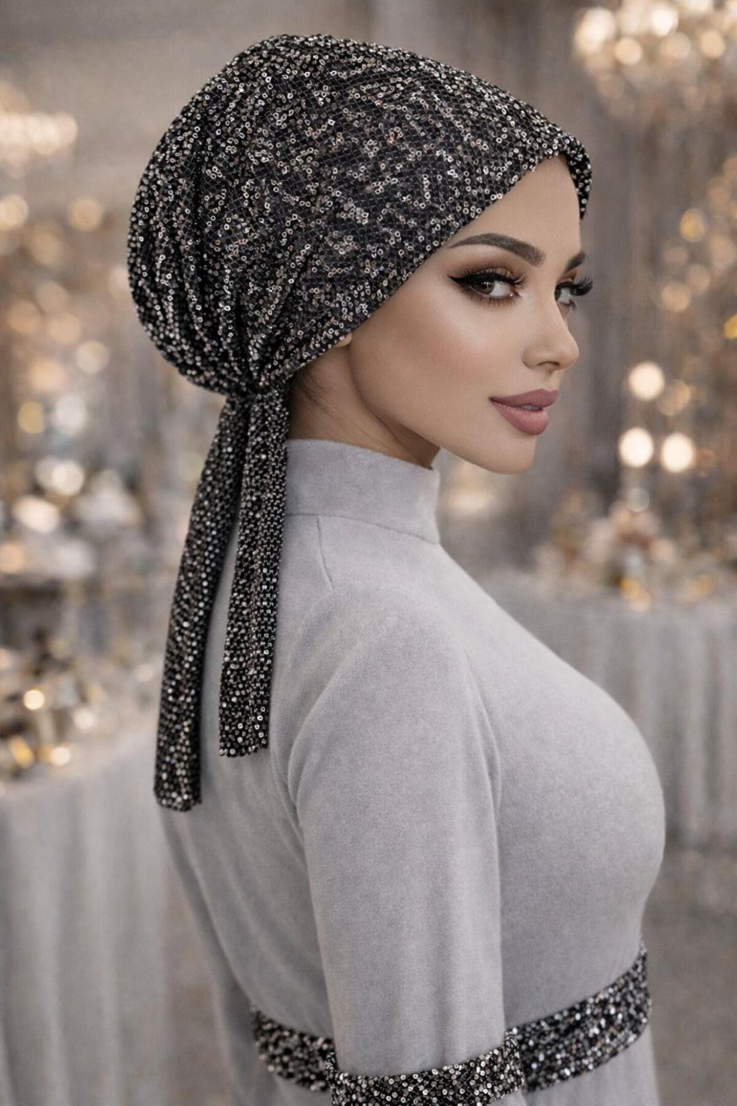 Özel davetlerde kuaför randevularına ve saatlerce süren şal bağlama zahmetine son! Antrasit Payet İşlemeli Abiye Eşarp Bone, siyah zemin üzerine titizlikle işlenmiş gümüş-antrasit payetleriyle nişan, düğün ve tüm seçkin davetler için tasarlandı. Gerçek payet dokusuyla saniyeler içinde büyüleyici bir şıklığa kavuşmanızı sağlar.