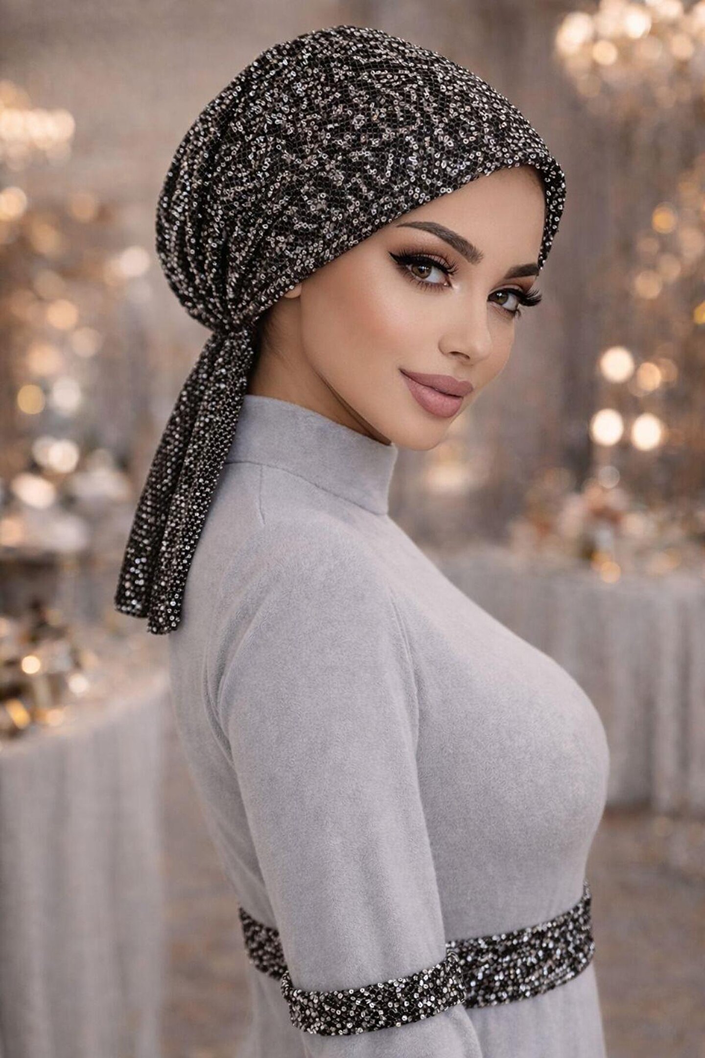 Özel davetlerde kuaför randevularına ve saatlerce süren şal bağlama zahmetine son! Antrasit Payet İşlemeli Abiye Eşarp Bone, siyah zemin üzerine titizlikle işlenmiş gümüş-antrasit payetleriyle nişan, düğün ve tüm seçkin davetler için tasarlandı. Gerçek payet dokusuyla saniyeler içinde büyüleyici bir şıklığa kavuşmanızı sağlar.