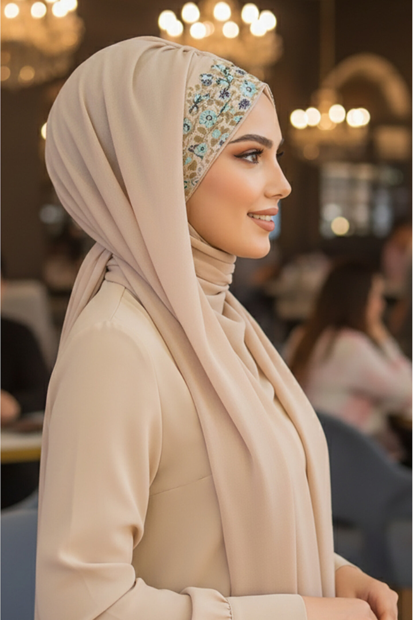 Aişe tesettür Bej Çiçek Desen Hazır Şal