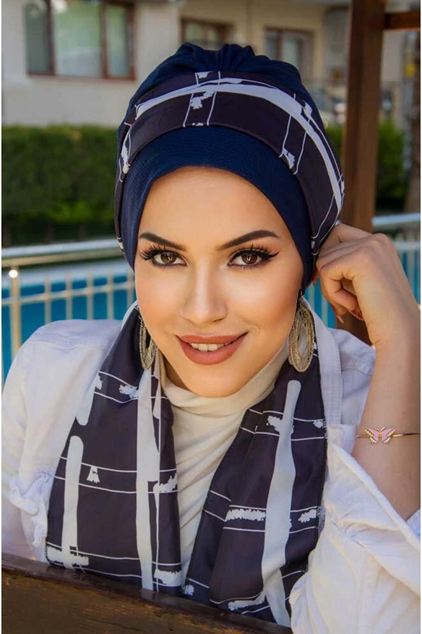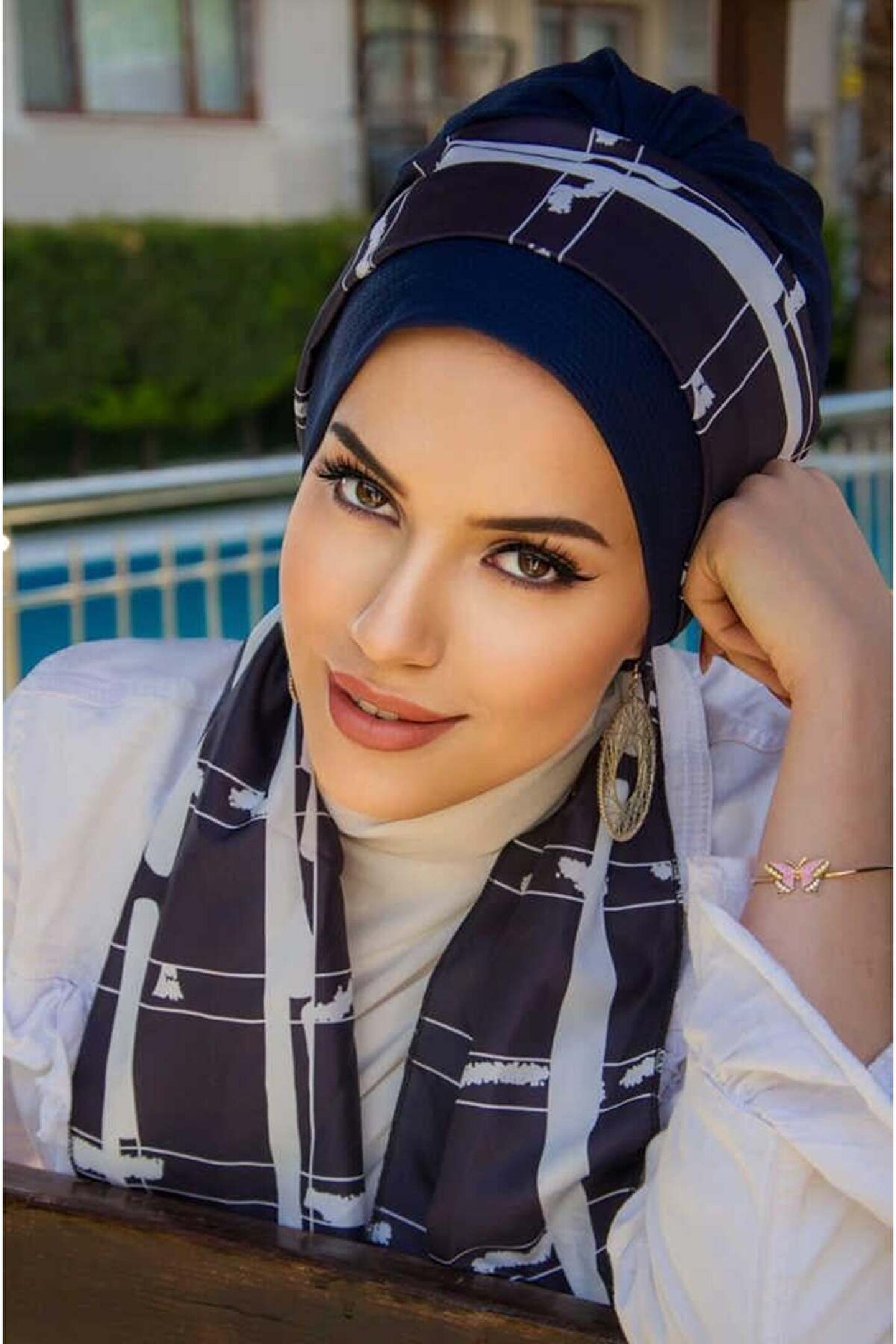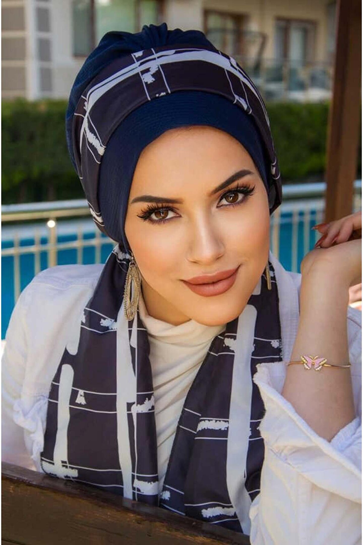 Aişe tesettür Beyaz Lacivert Geometrik Desen Fularlı Bone