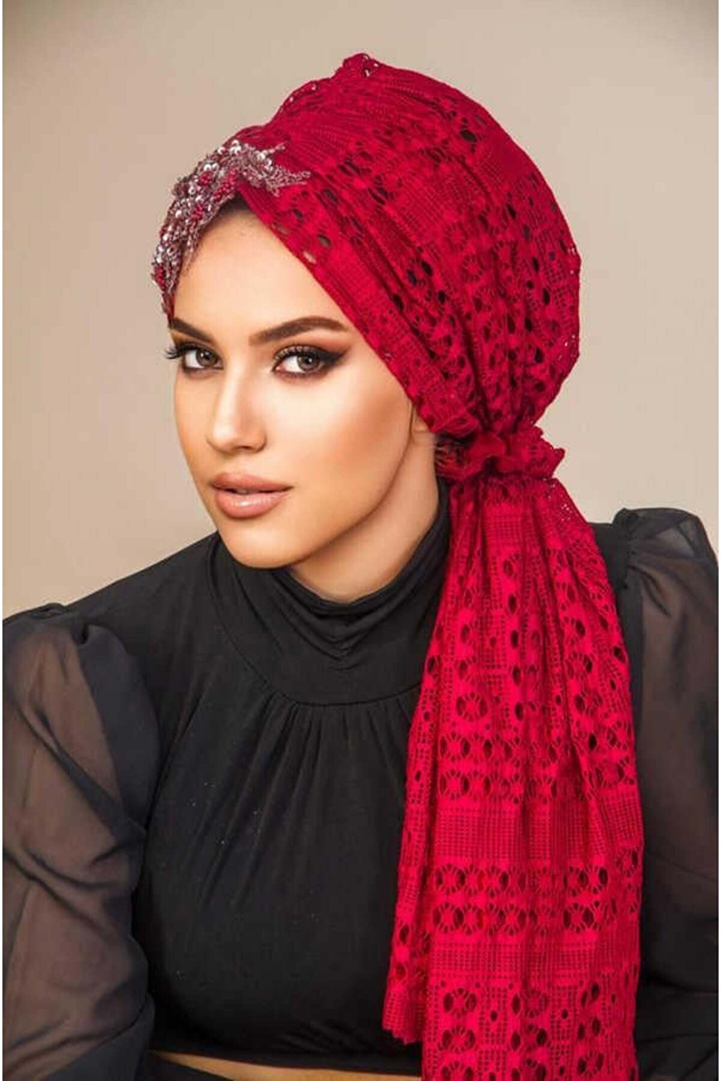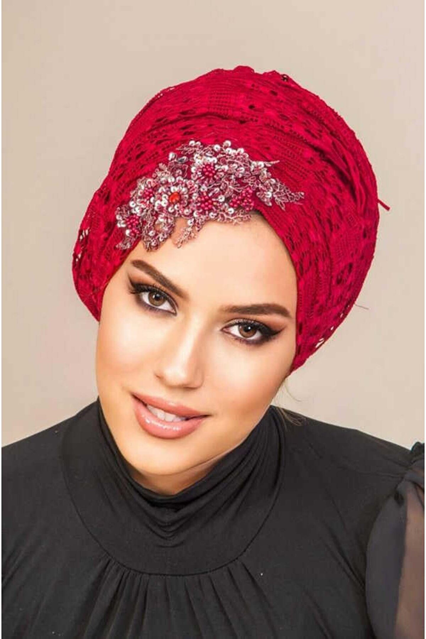 Aişe tesettür Bordo Güpürlü Abiye Tokalı Bone