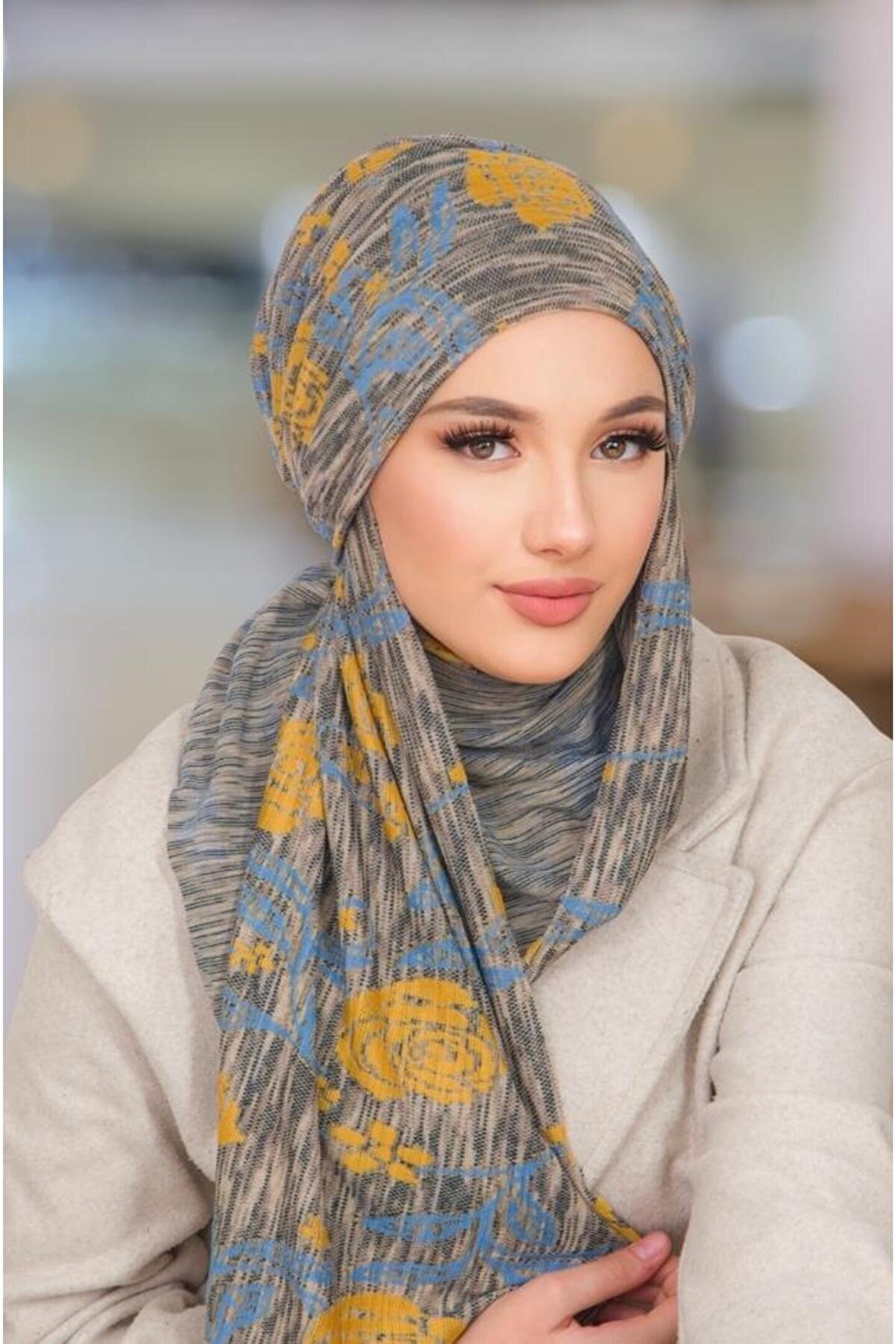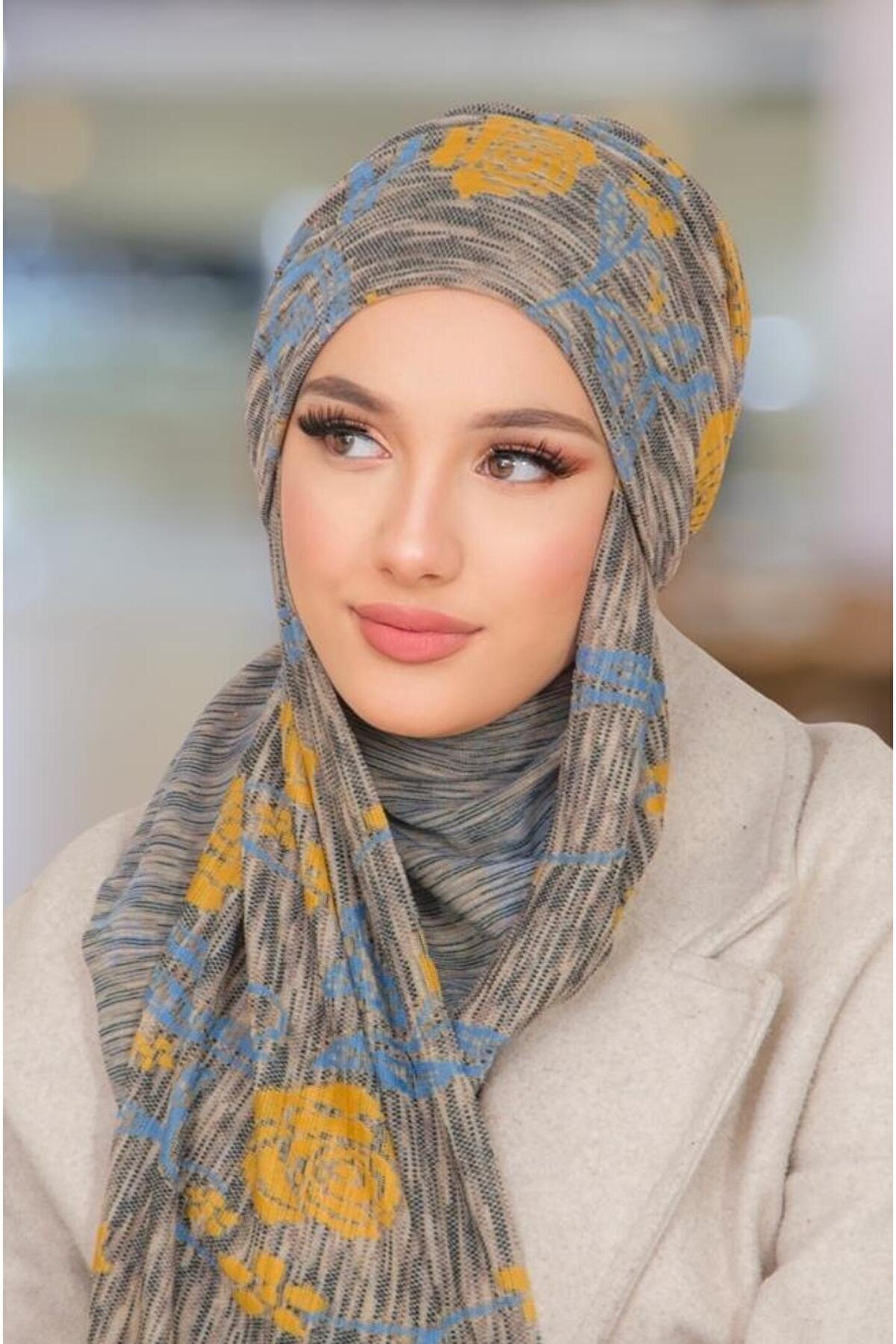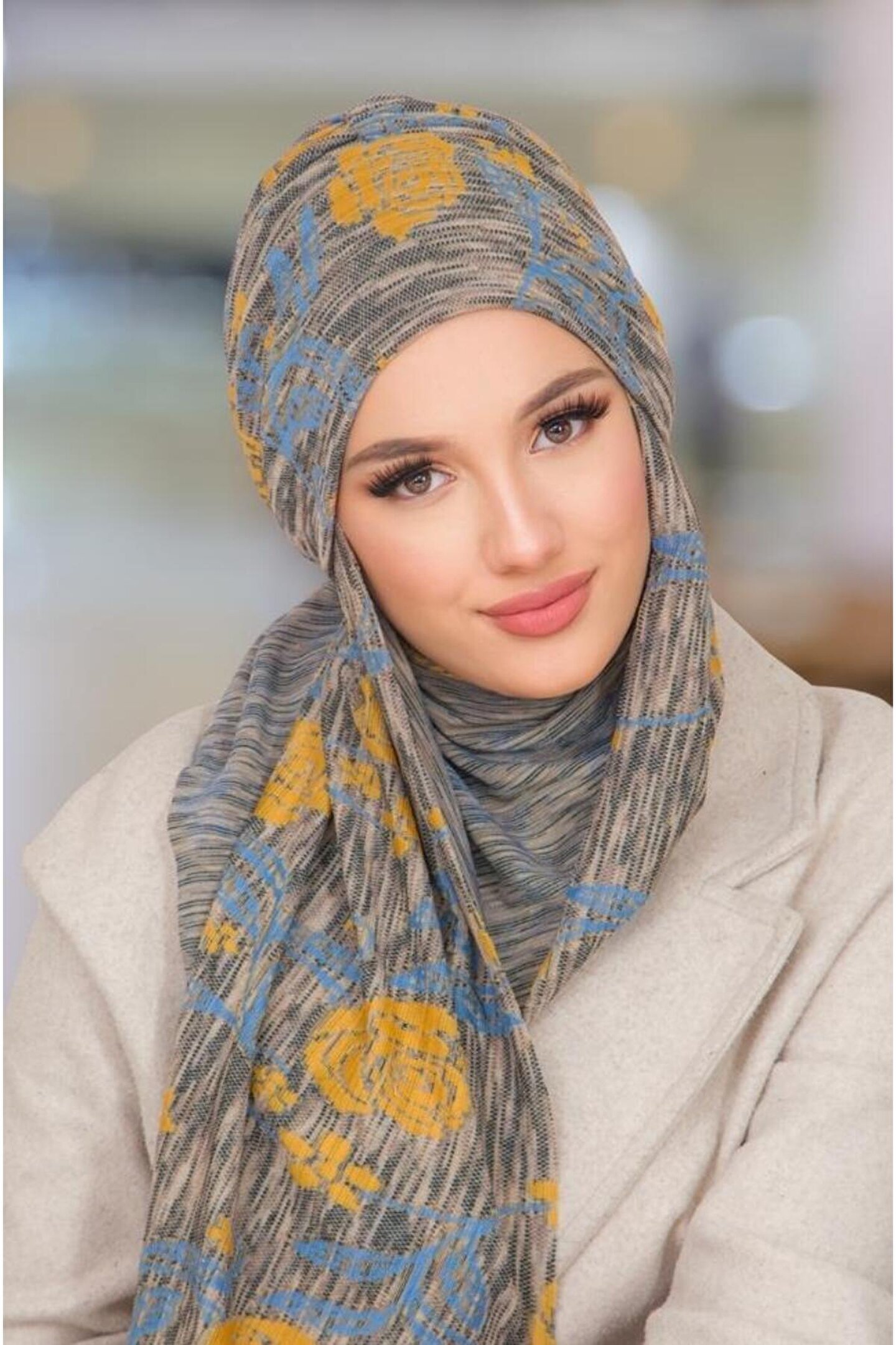 Aişe tesettür Gri Hardal Desen Kelebek Bone Şal