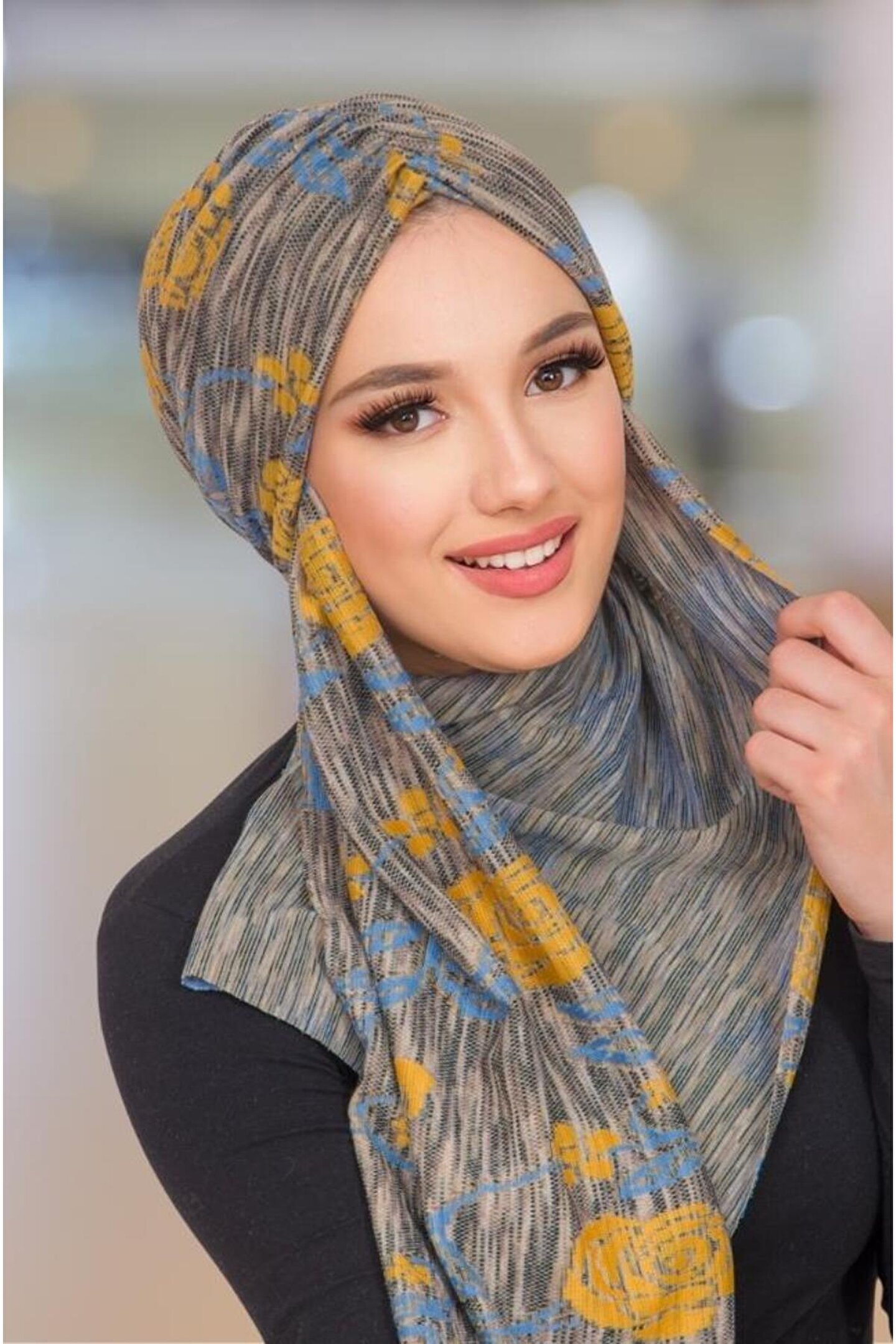 Aişe tesettür Gri Hardal Desen Kelebek Model Büzgülü Bone Şal