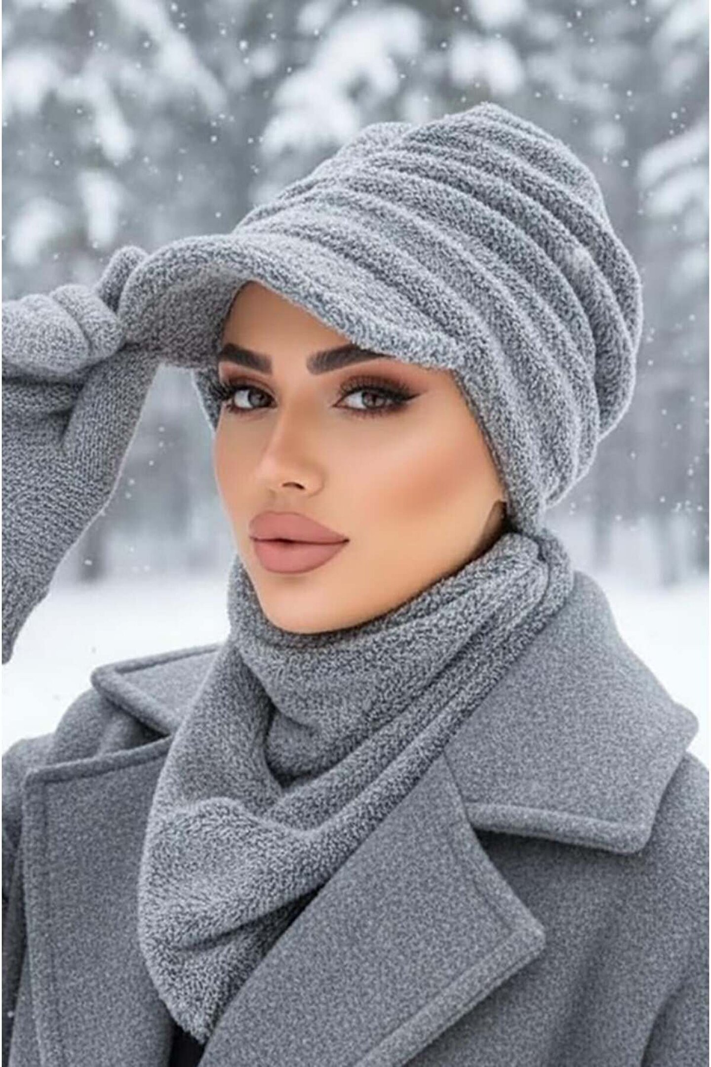 Aişe tesettür Gri Kürk Şapka ve Etol Takım
