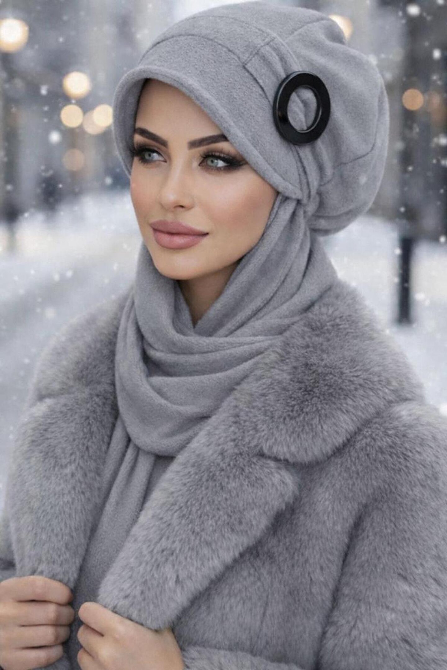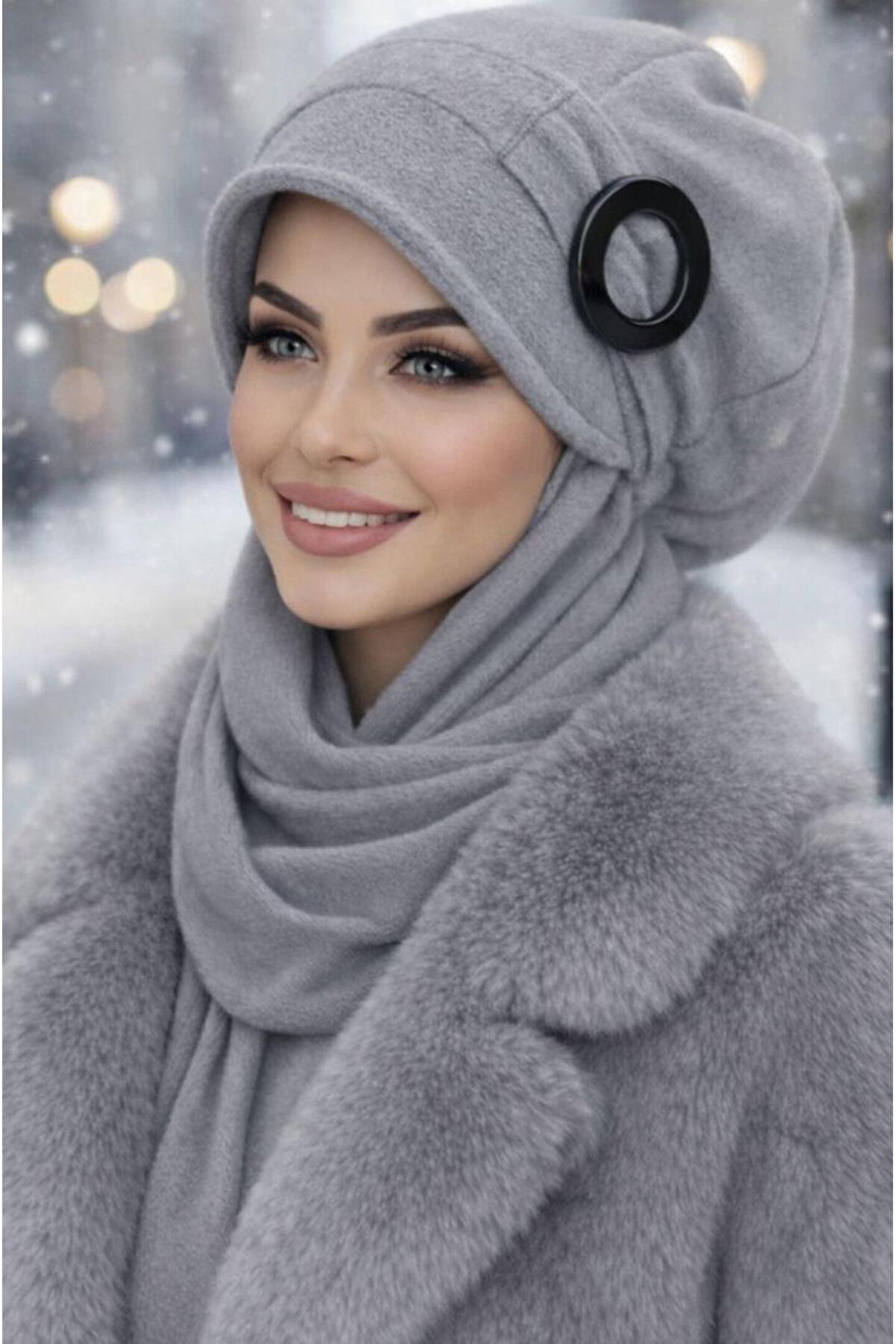 Gri Siyah Tokalı Kışlık Tesettür Bone Şapka - Pamuklu Polar