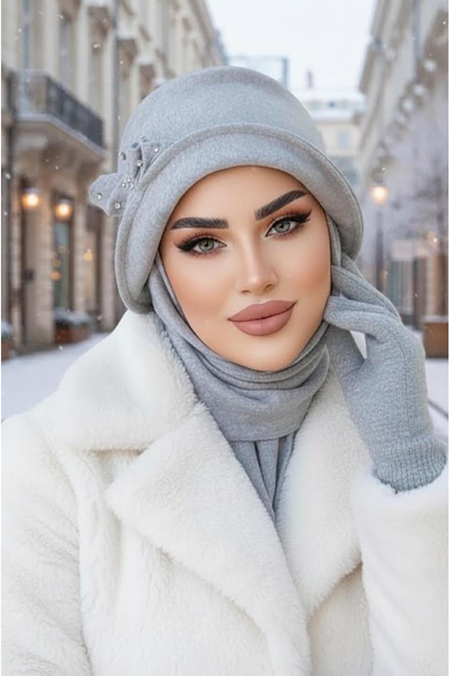 Aişe tesettür Gri Taşlı Aksesuarlı Vintage Şapka