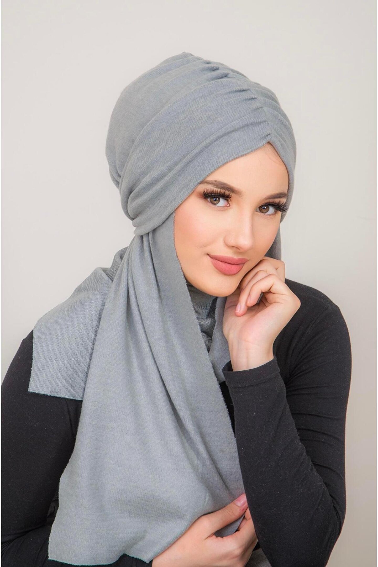 Aişe tesettür Gri Triko Kelebek Model Büzgülü Bone Şal