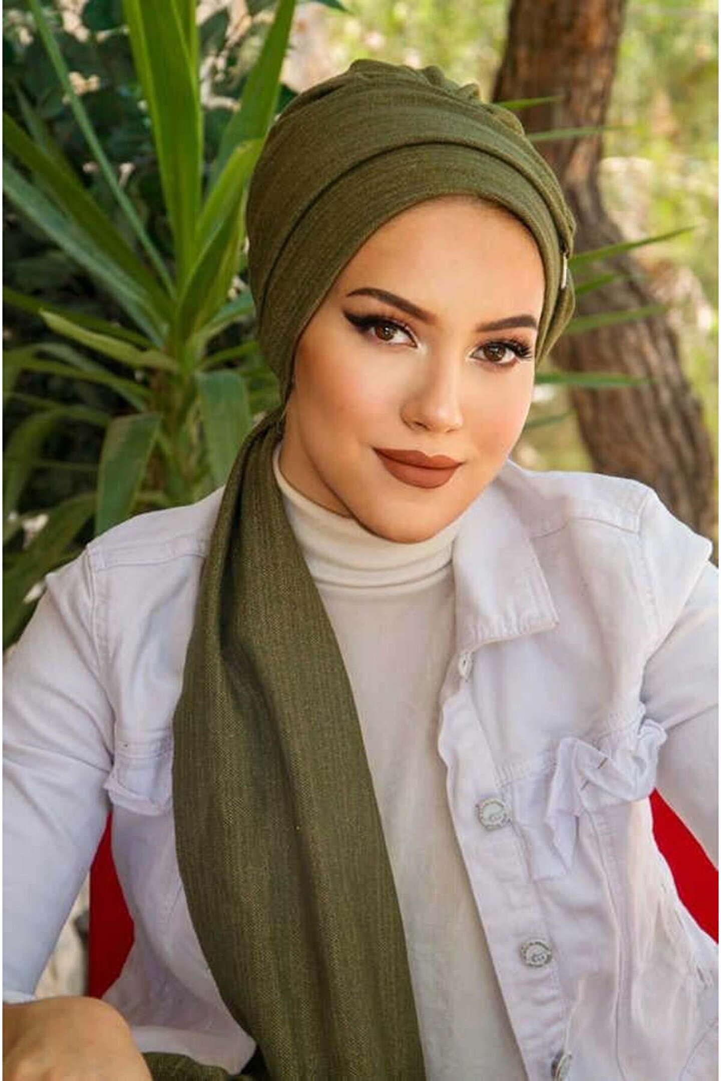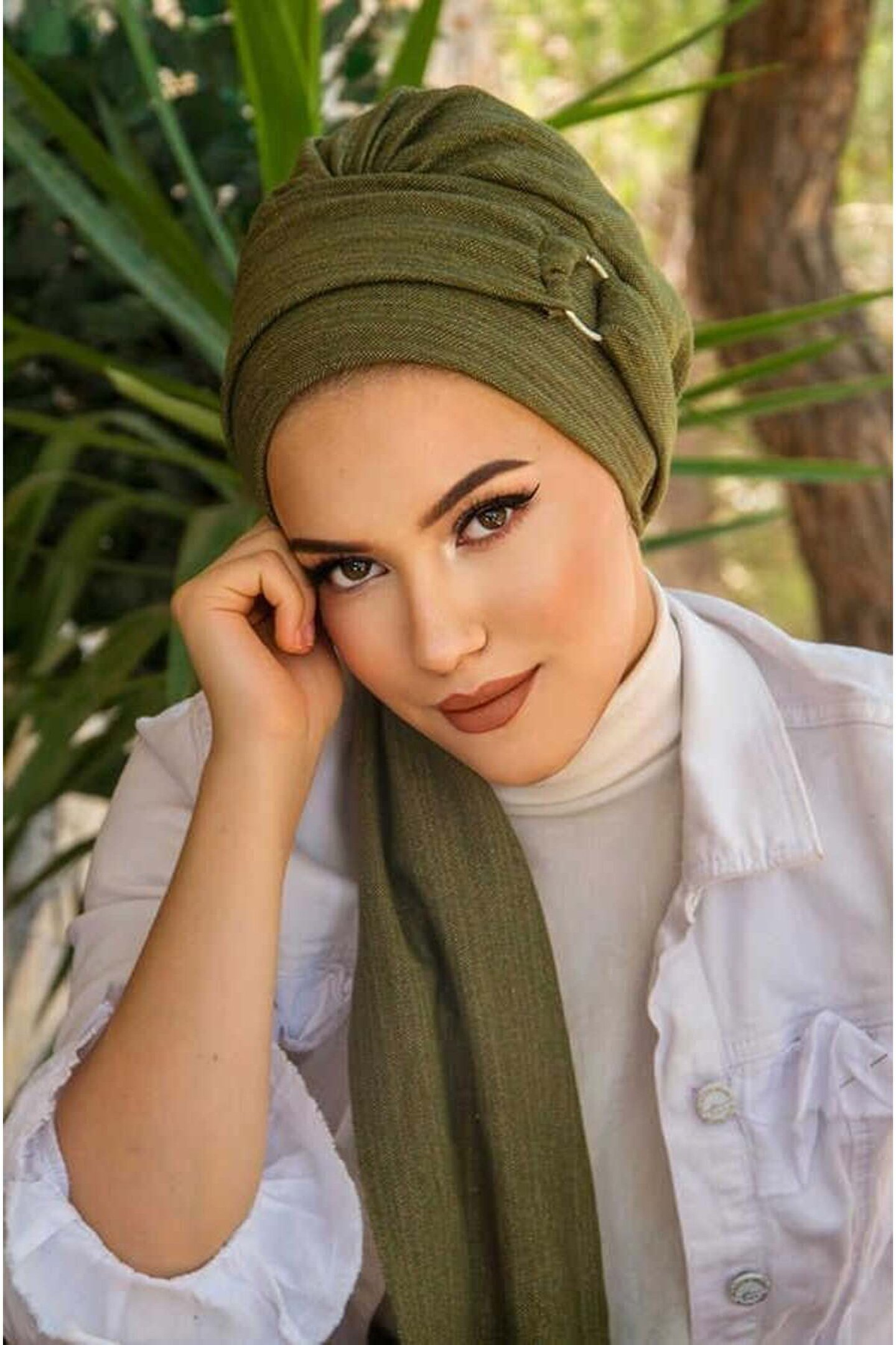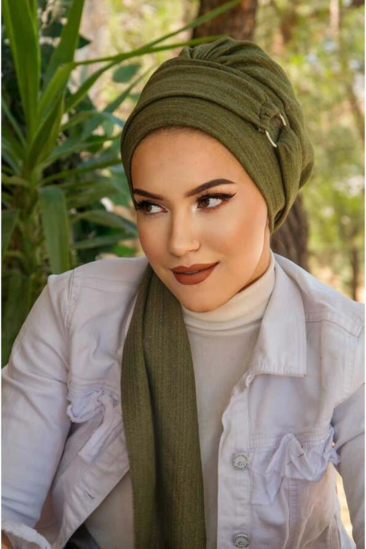 Aişe tesettür Haki Işıltılı Toka Detaylı Atkılı Bone