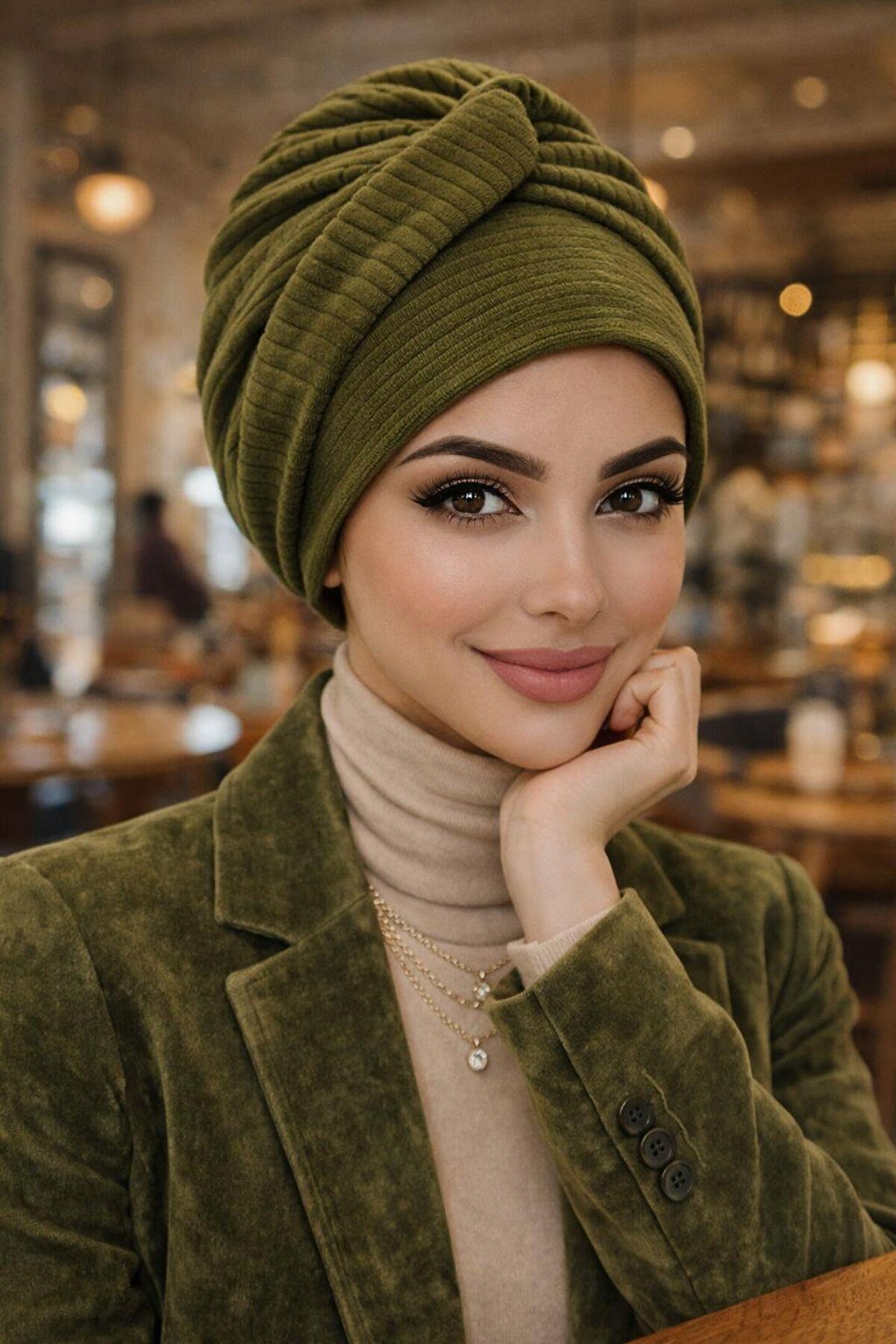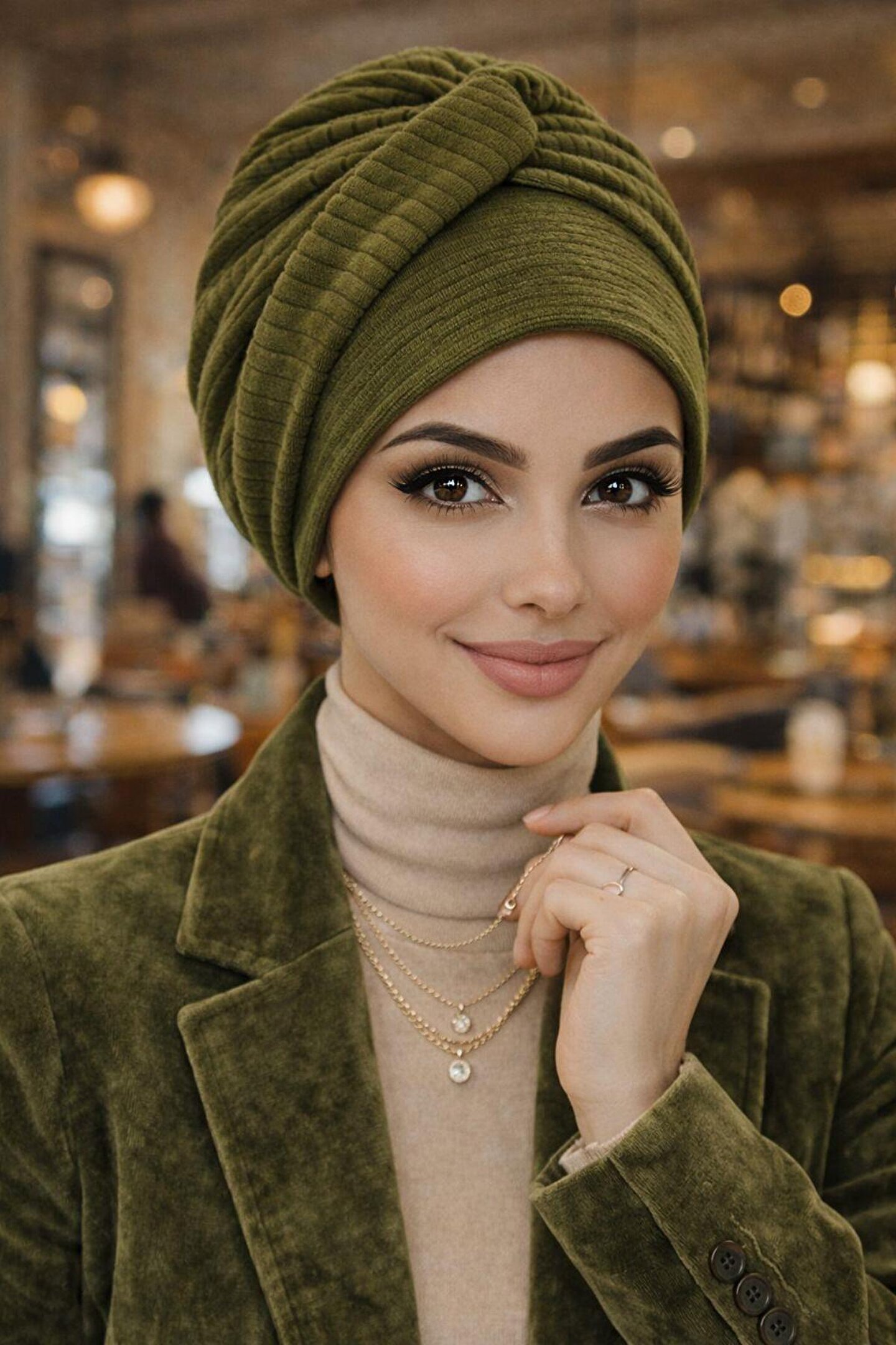 Soğuk kış günlerinde zarafetinizden ödün vermeyin! Haki Kadife Burgu Bantlı Hazır Bone, kadifenin zamansız şıklığını modern bir tasarım olan burgu taç detayıyla buluşturuyor. Kış kombinlerinize anında lüks bir hava katarken, sıcak tutan dokusuyla konforu zirveye taşıyor.