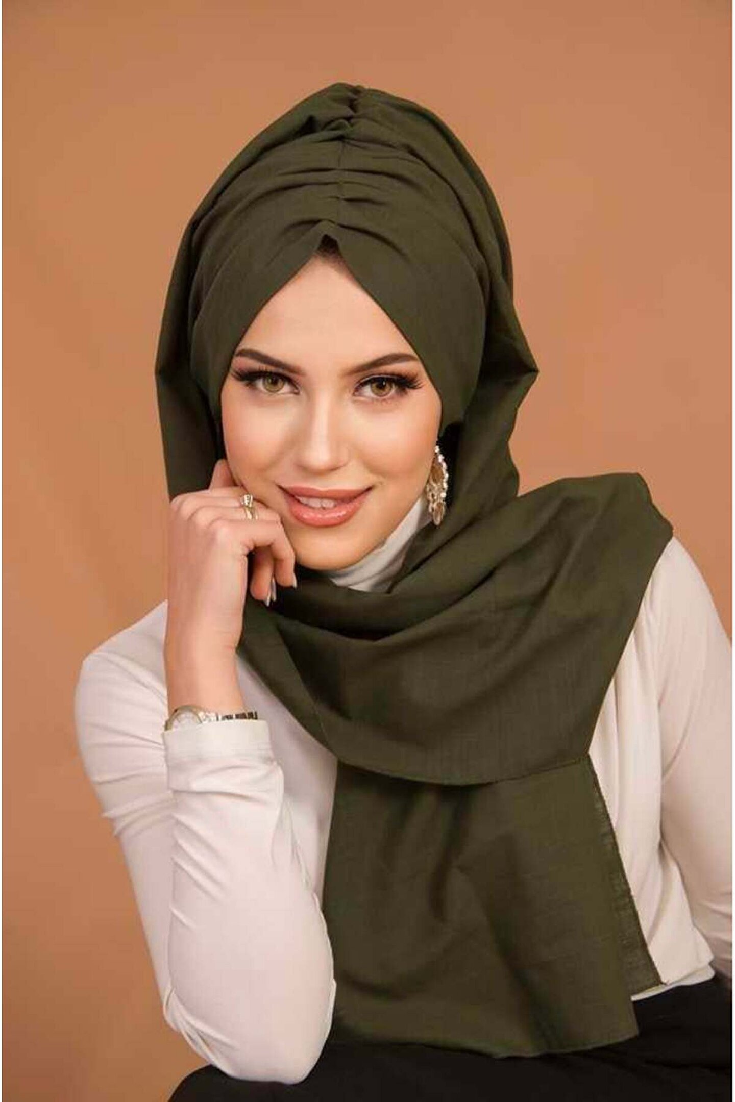 Haki Kelebek Model Büzgülü Bone Şal Tak Çık Modeliyle Çok Şık