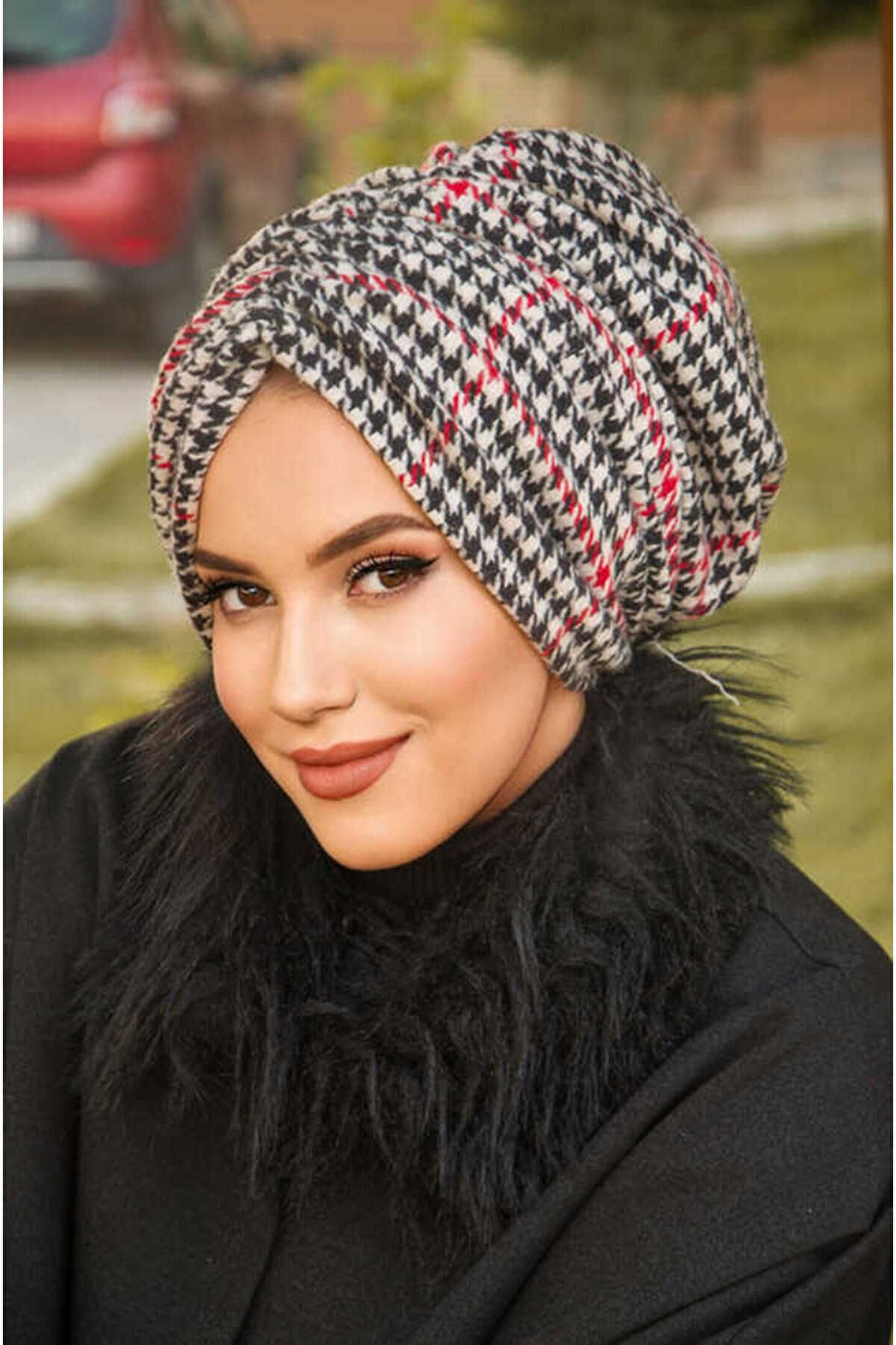 Kazayağı Kırmızı Desenli Kışlık Büzgülü Bone