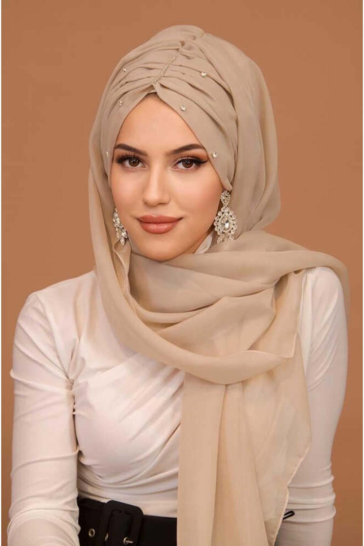Aişe tesettür Kemik Rengi Taşlı Büzgü Model Hazır Abiye Şal