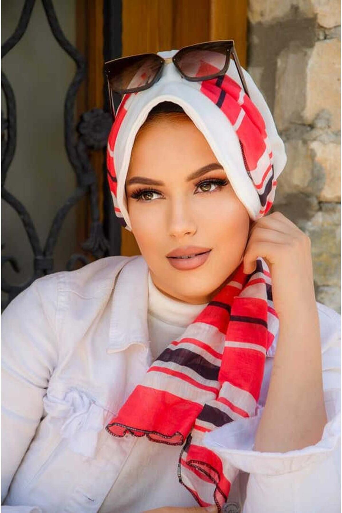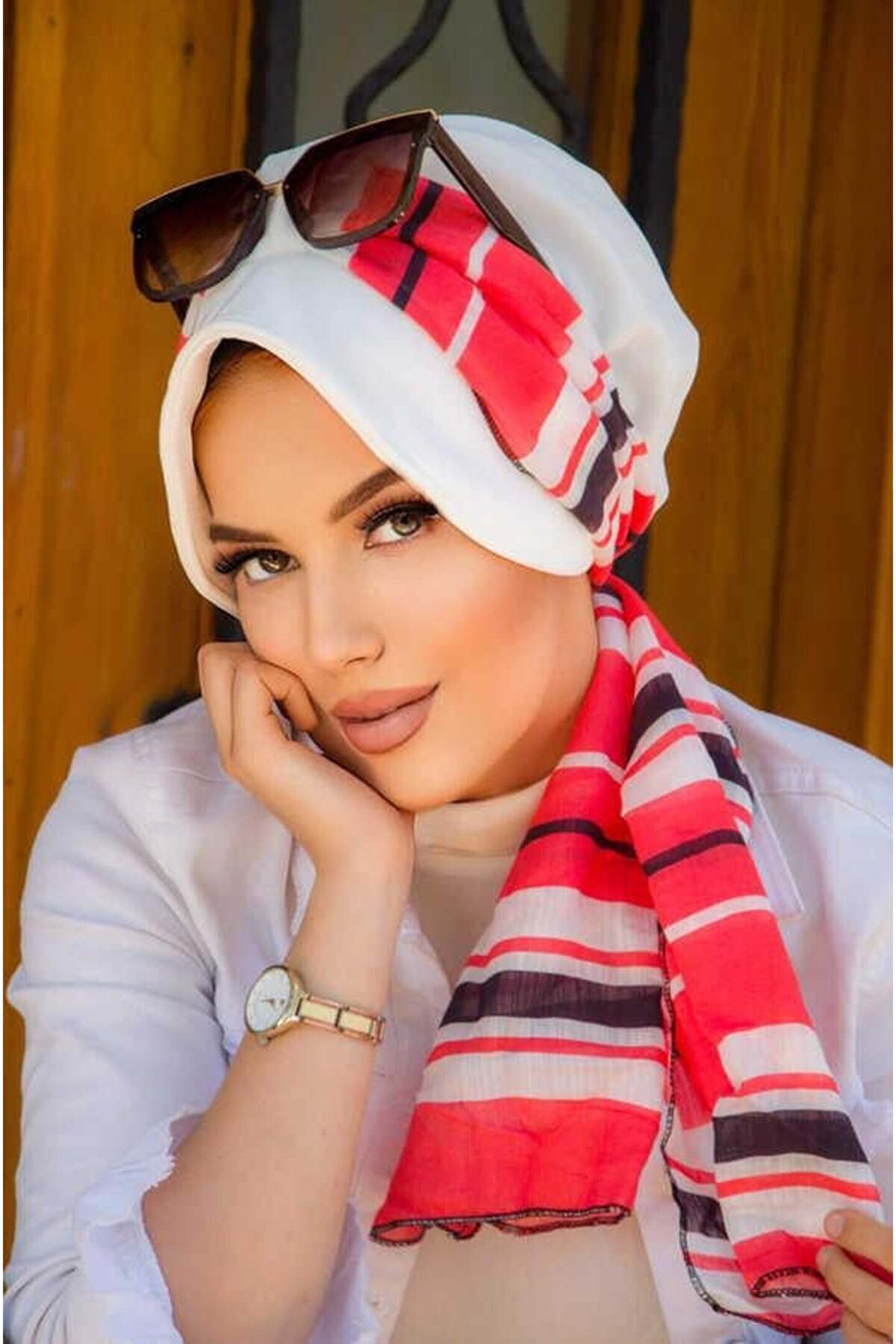 Aişe tesettür Kırık Beyaz Mercan Çizgi Desen Fularlı Şapka