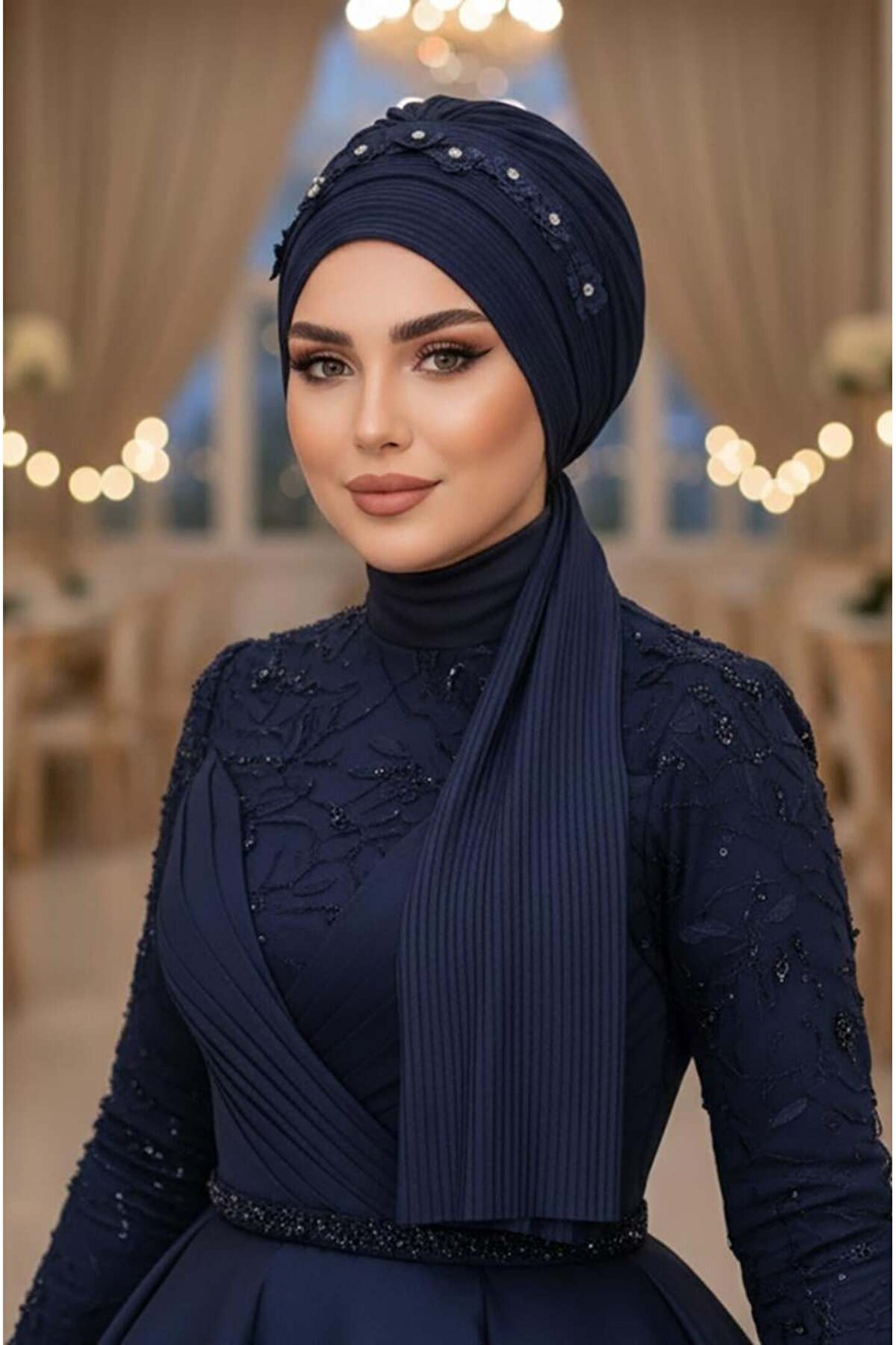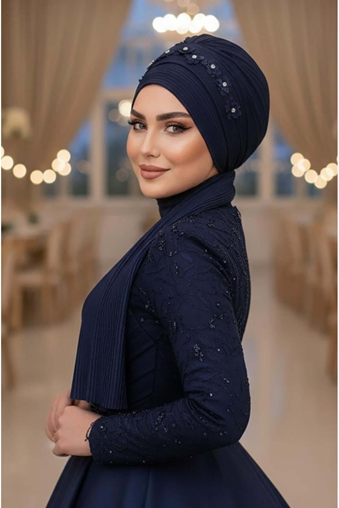 Aişe tesettür Lacivert Aksesuarlı Atkılı Abiye Bone