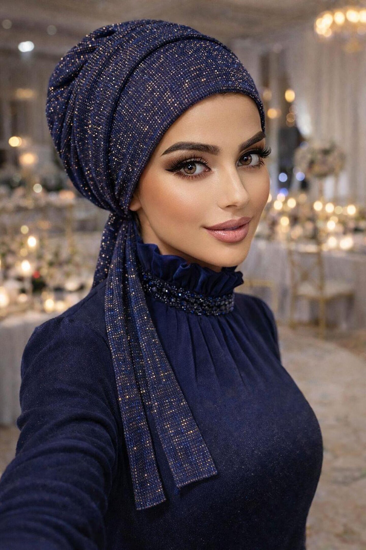 Aişe tesettür Lacivert Gold Işıltılı Atkılı Tesettür Bone