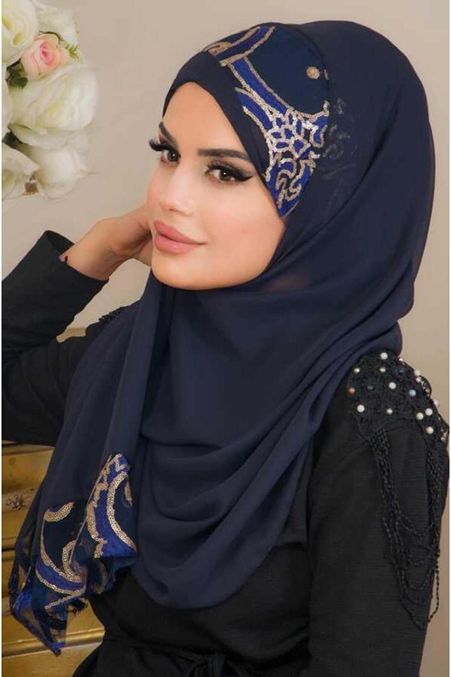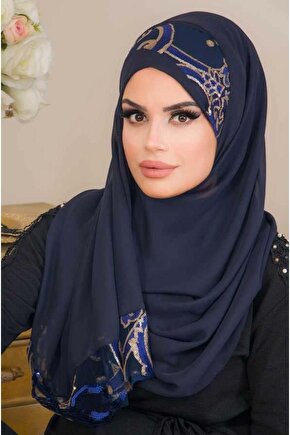 Lacivert Payetli Abiye Double Şal Kumaş Cinsi : Fransız Şifon Ürün Özelliği : Çift kat oluşu ile iç göstermez esnek formuyla başınızı sarar rahat kullanım özgürlüğü sunar; İade ve değişim : 15 gün içinde koşulsuz iade ve değişim Teslimat Tarihi : Türkiye içi 2; 4 iş günü / Avrupa; Amerika 4; 7 iş günü;