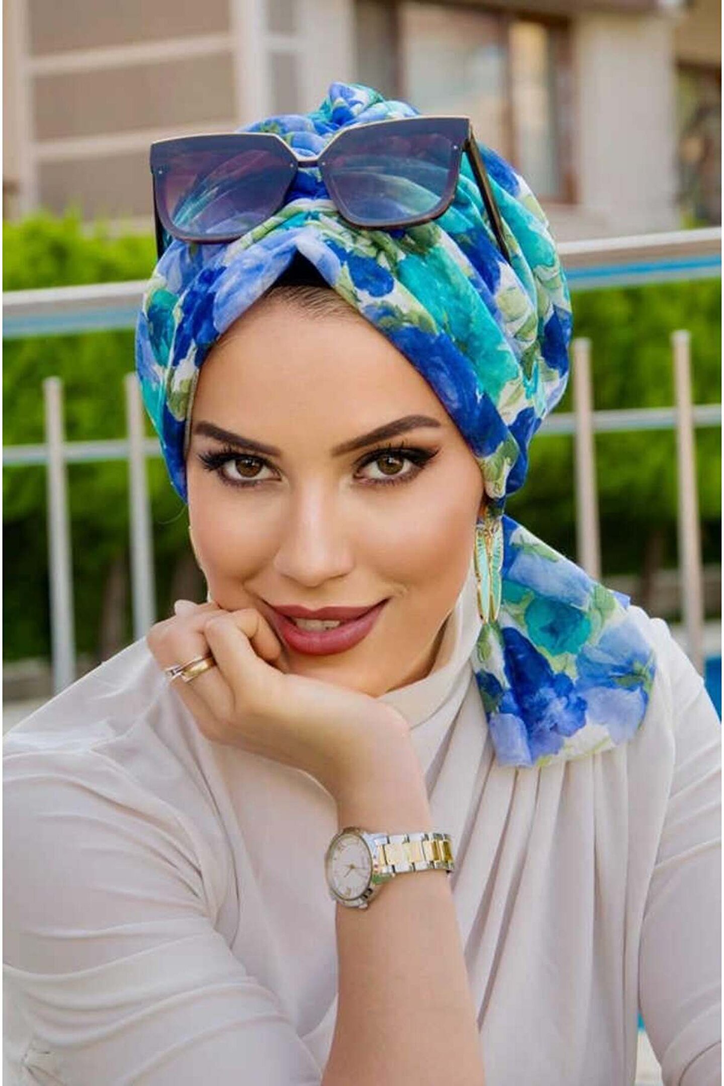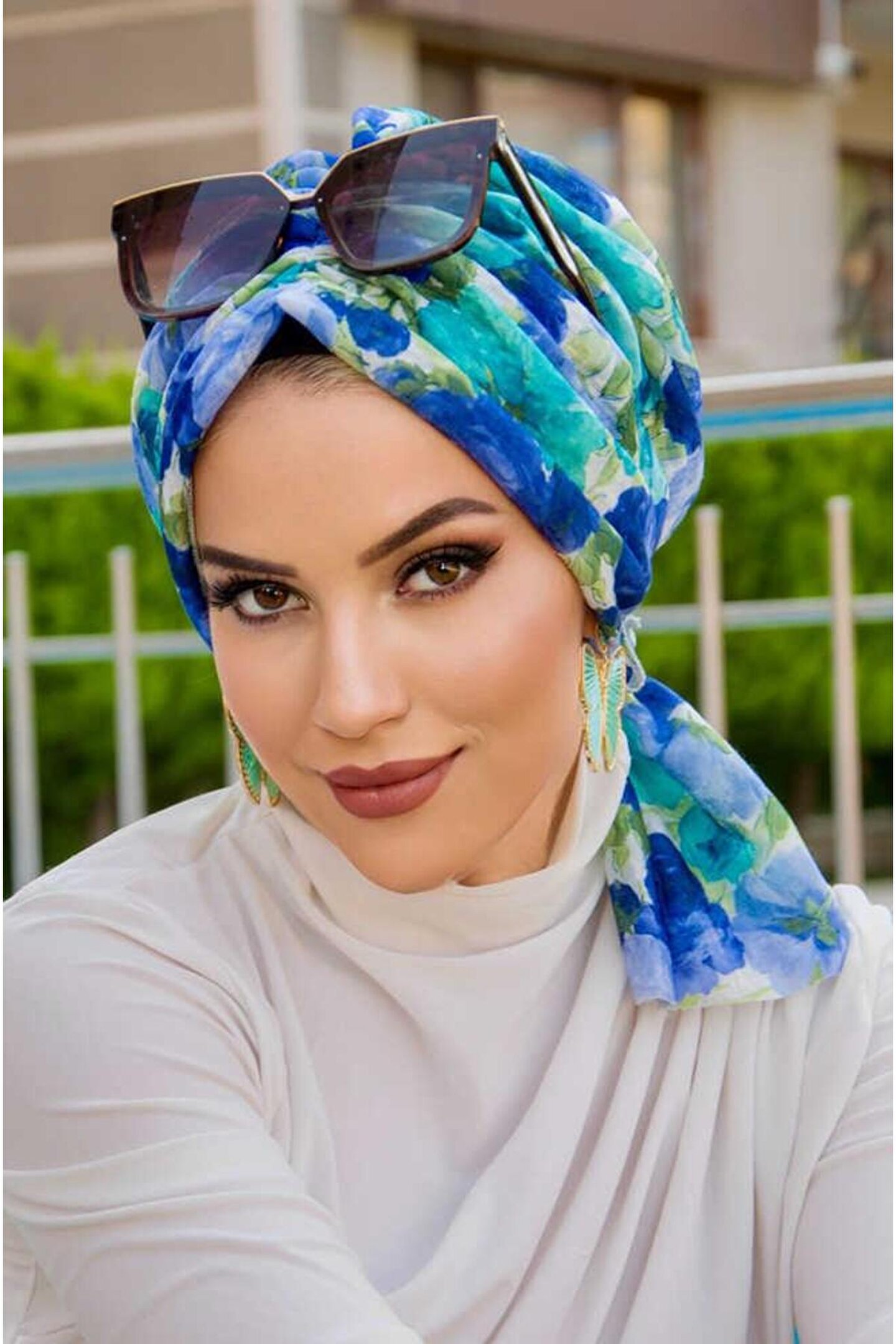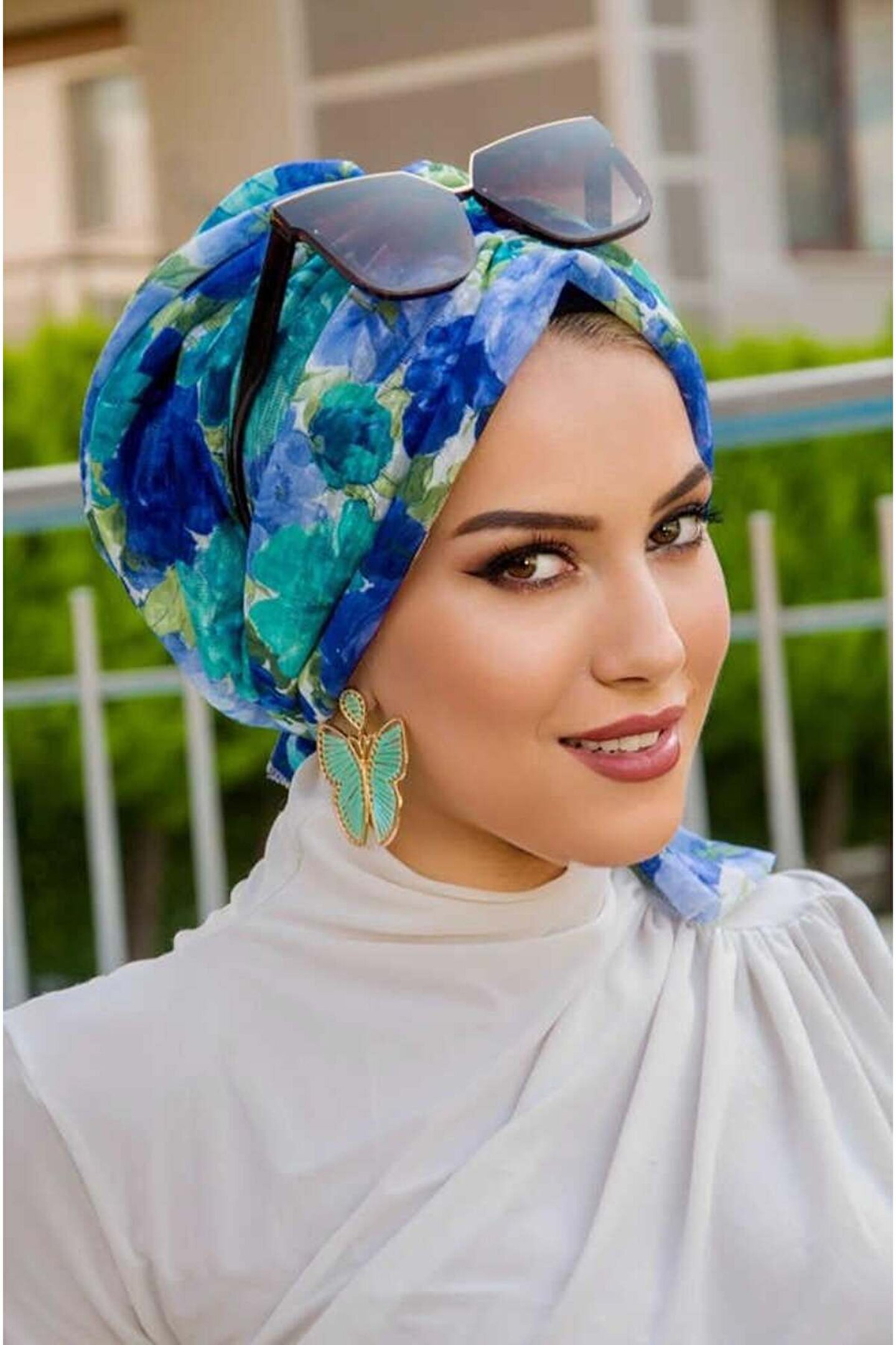 Aişe tesettür Lacivert Turkuaz Tonlu Çiçekli Tokalı Bone
