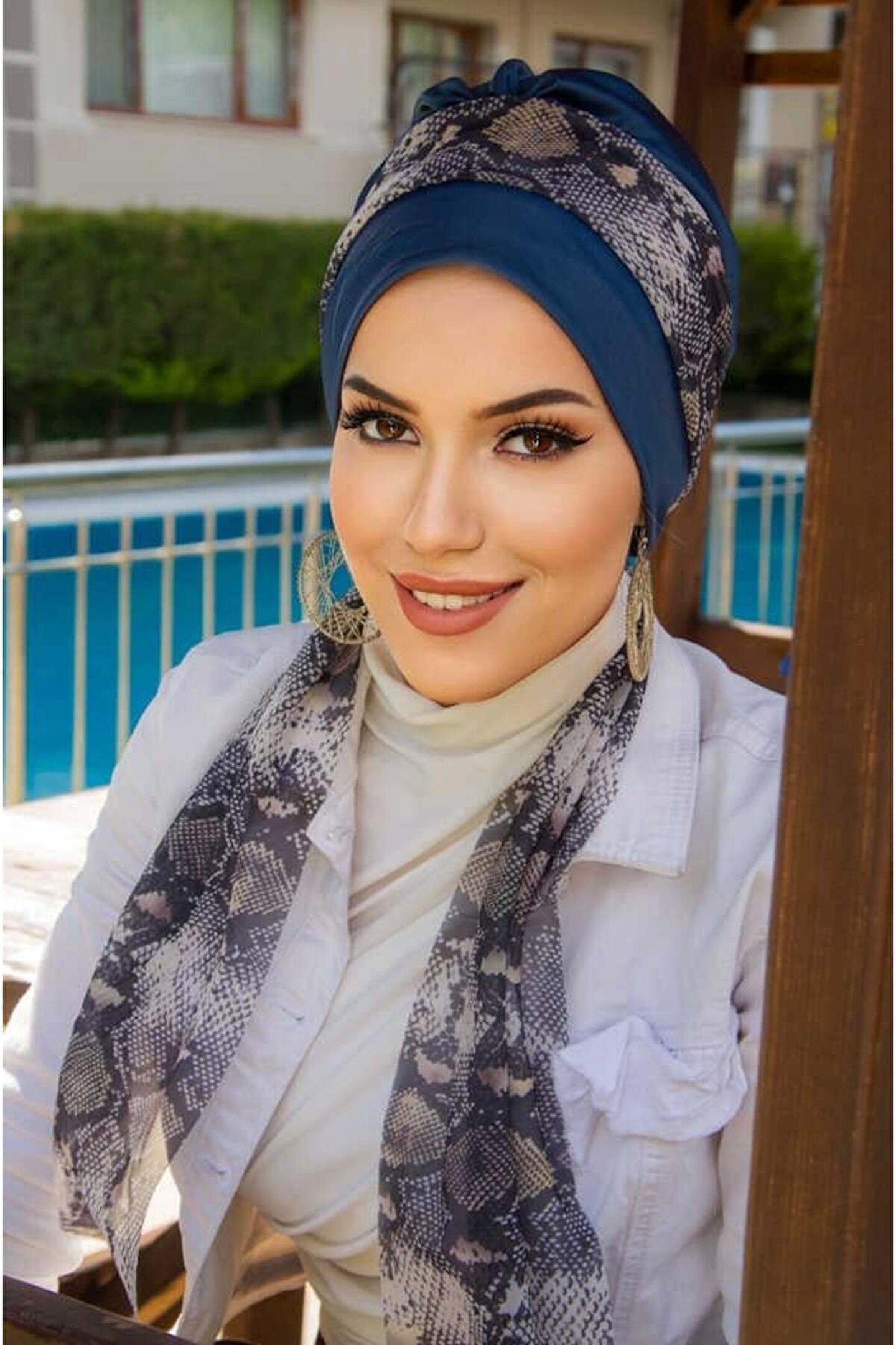 Aişe tesettür Lacivert Yılan Derisi Desen Fularlı Bone