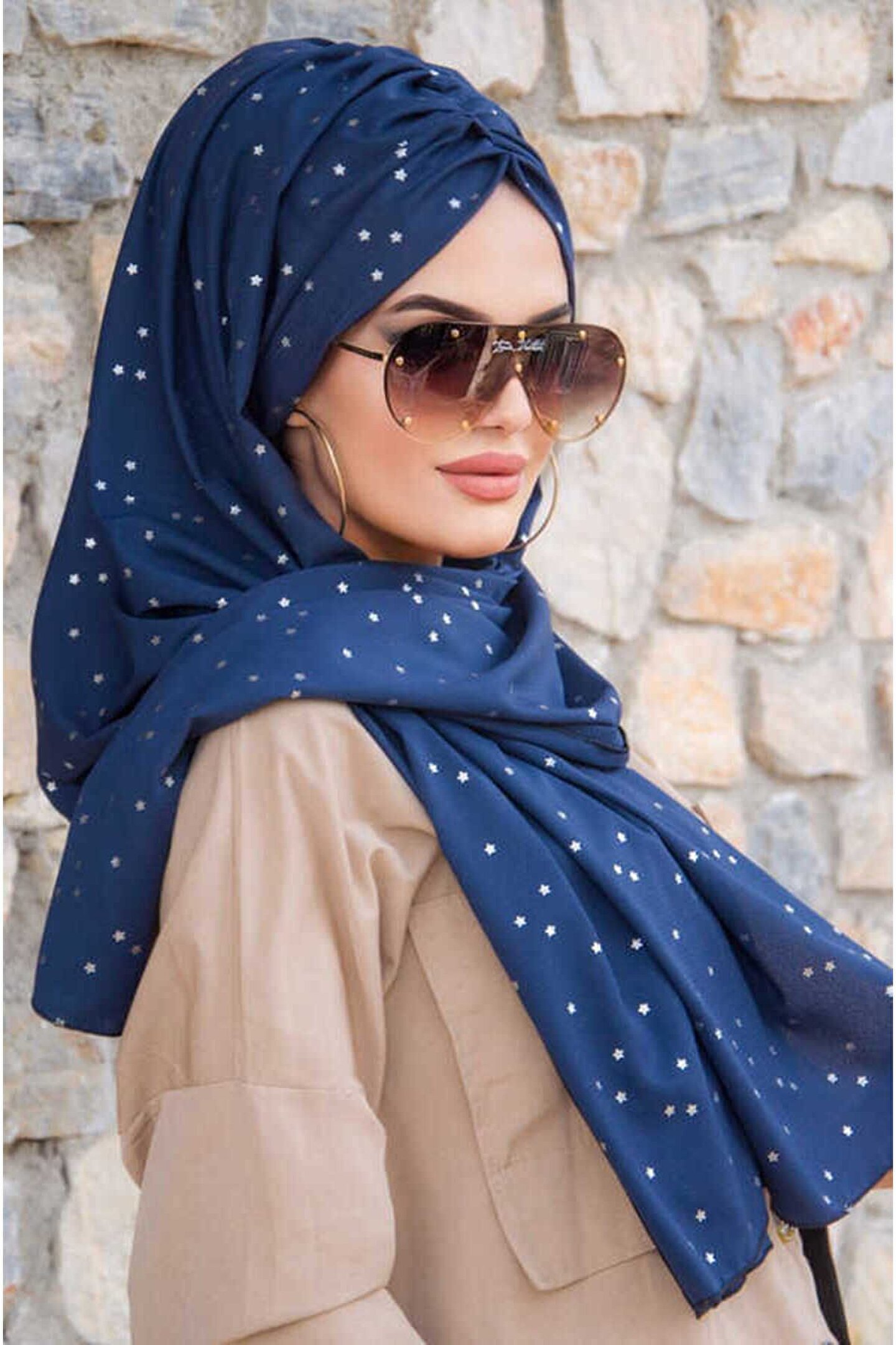 Lacivert Yıldız Şifon Hazır Şal - 50600