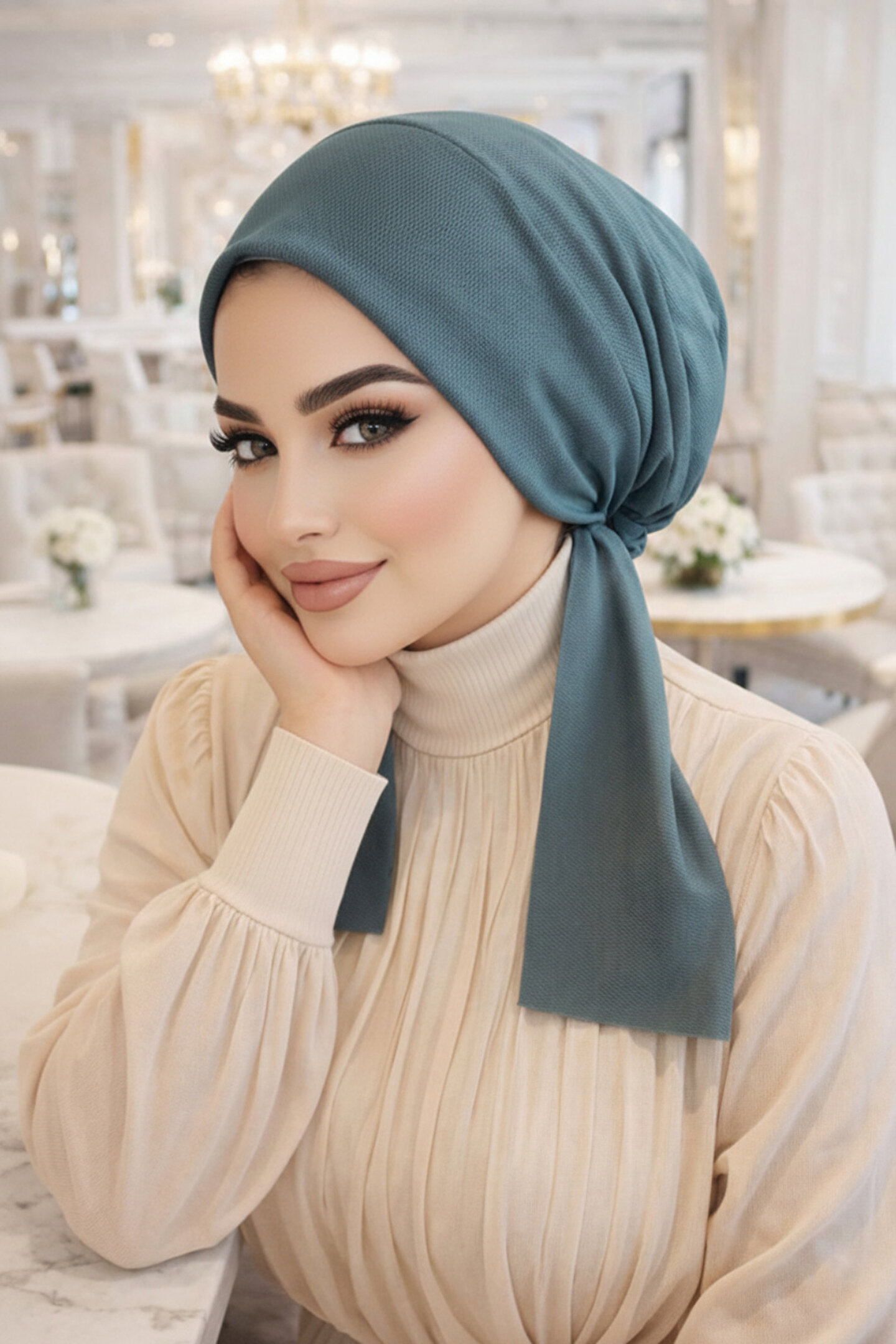 Zamanı kısıtlı ama stilinden ödün vermeyen kadınlar için tasarlanan Petrol Eşarp Bone, tesettür giyimde konforun yeni adı! Likralı örme kumaşın yumuşaklığı ve eşarp formundaki dökümlü uçlarıyla, iğne kullanmaya gerek kalmadan saniyeler içinde şık bir görünüm elde edebilirsiniz.