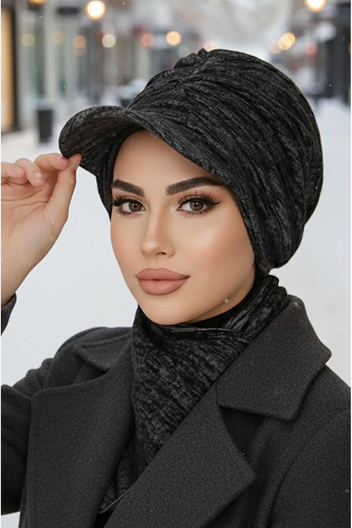 Aişe tesettür Siyah Gri Melanj Tesettür Şapka ve Etol Takım