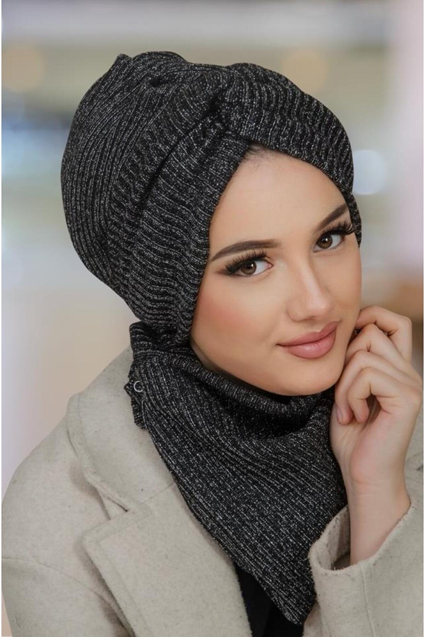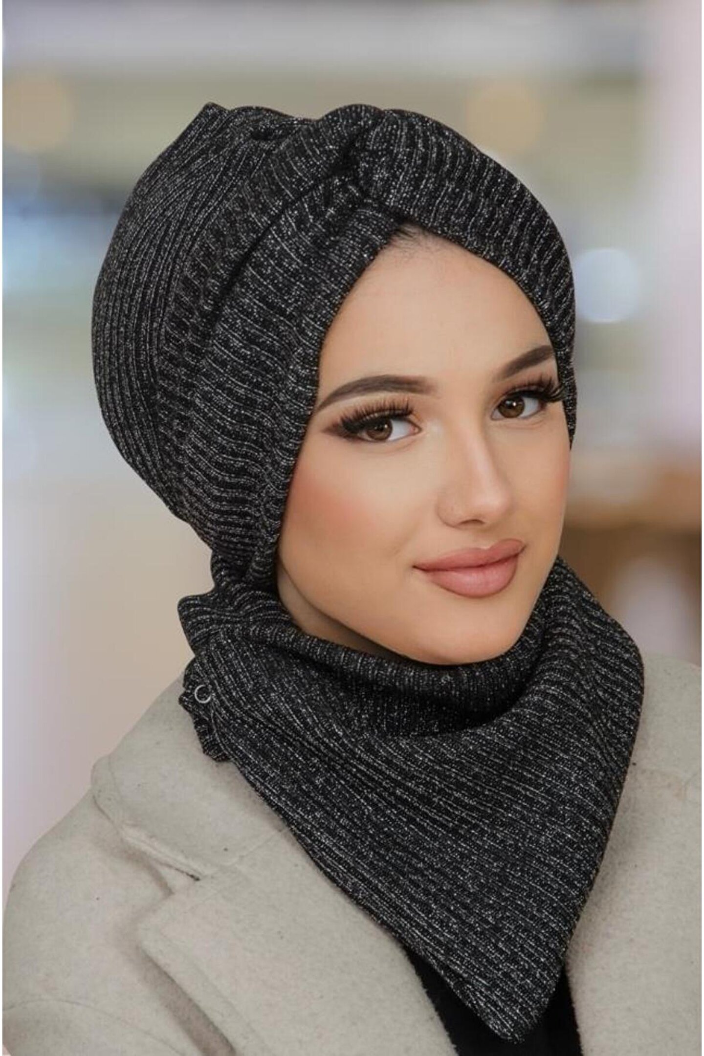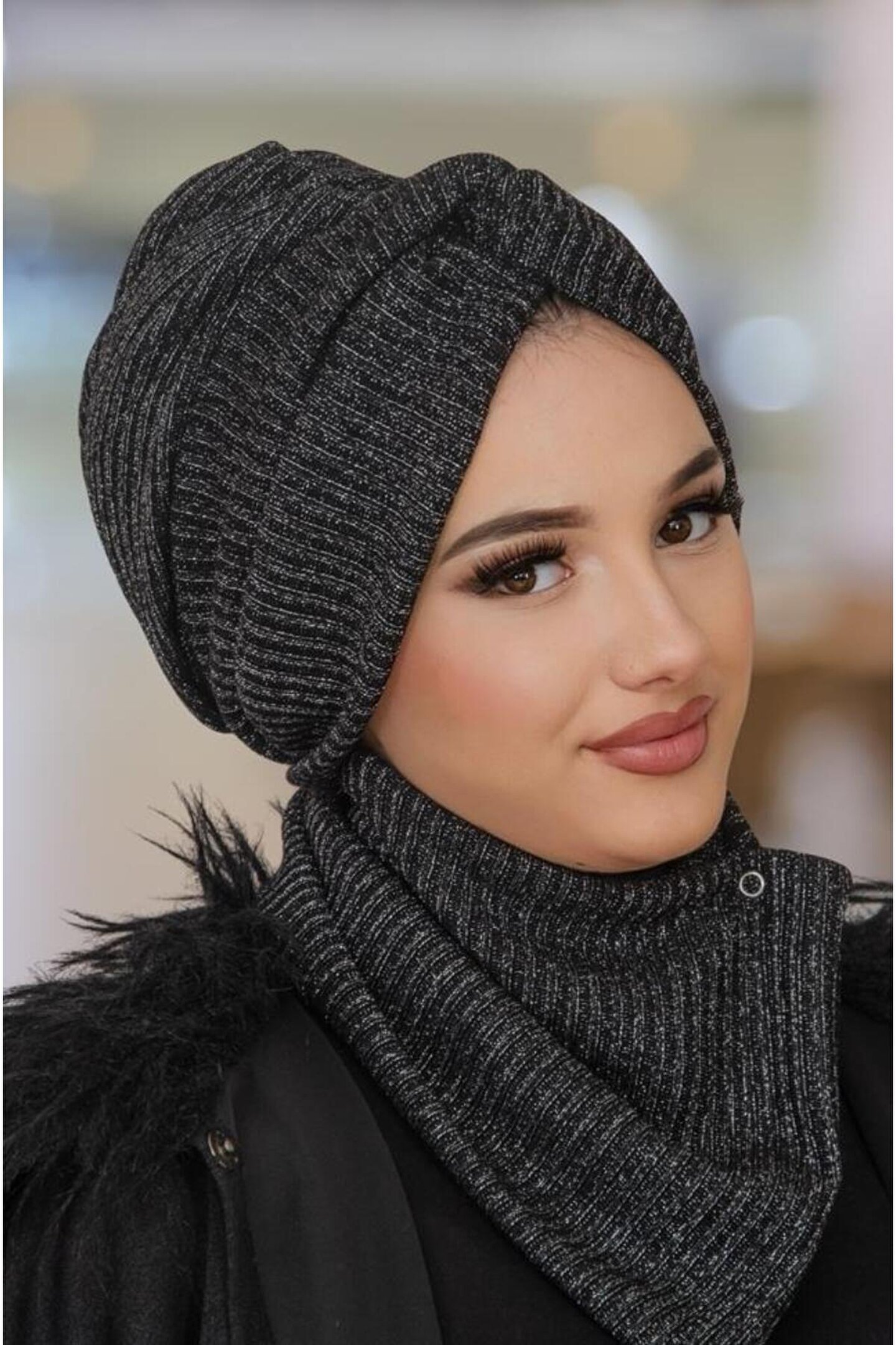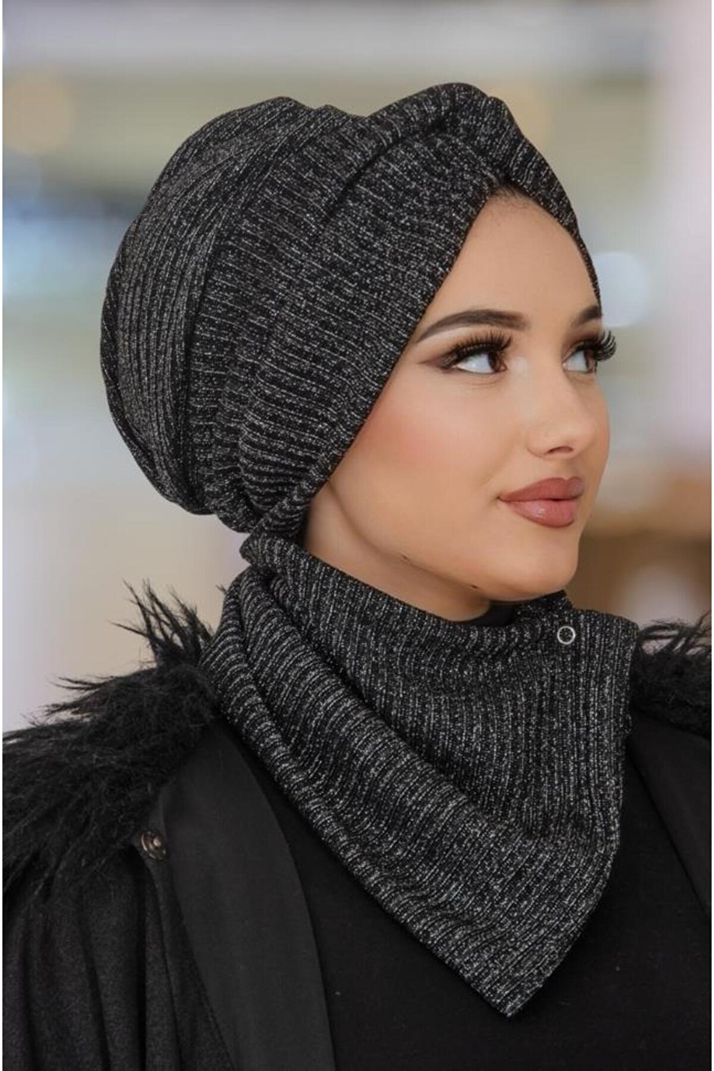 Aişe tesettür Siyah Gümüş Kışlık Burgu Bone Ve Etol Takım