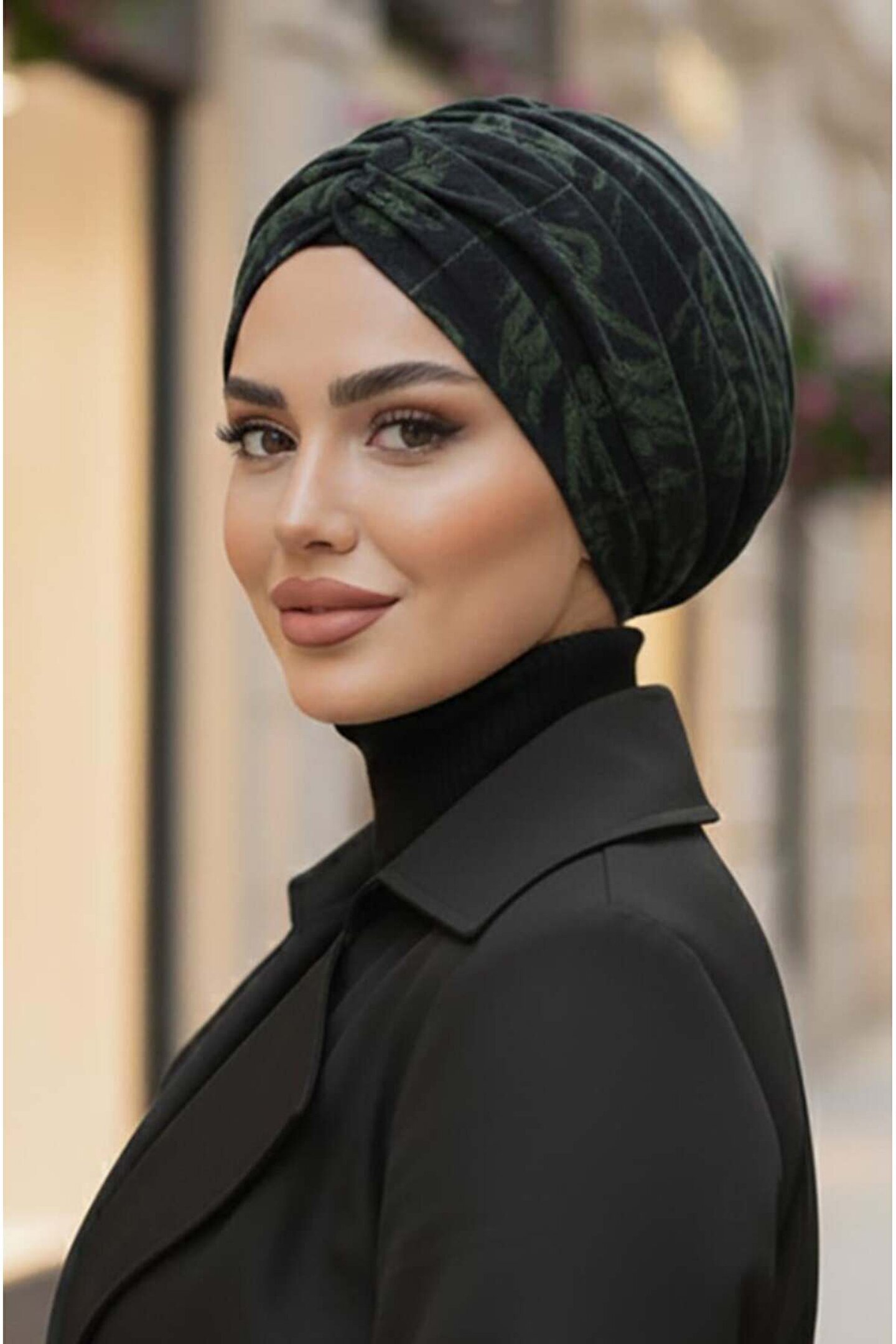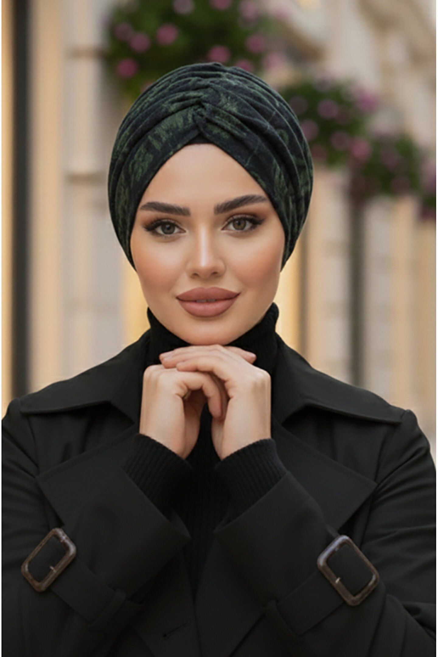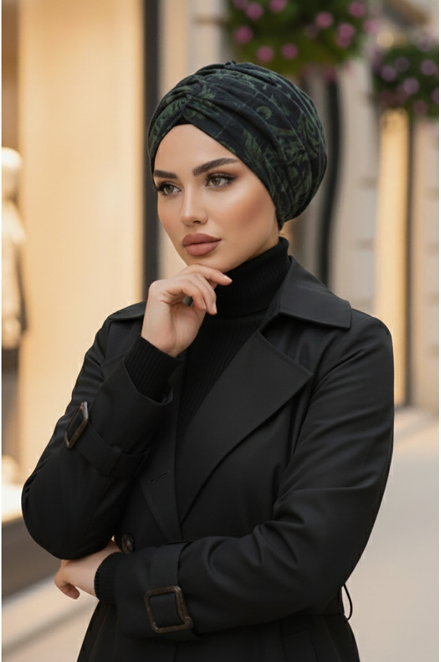 Aişe tesettür Siyah Haki Desenli Büzgülü Salaş Bone