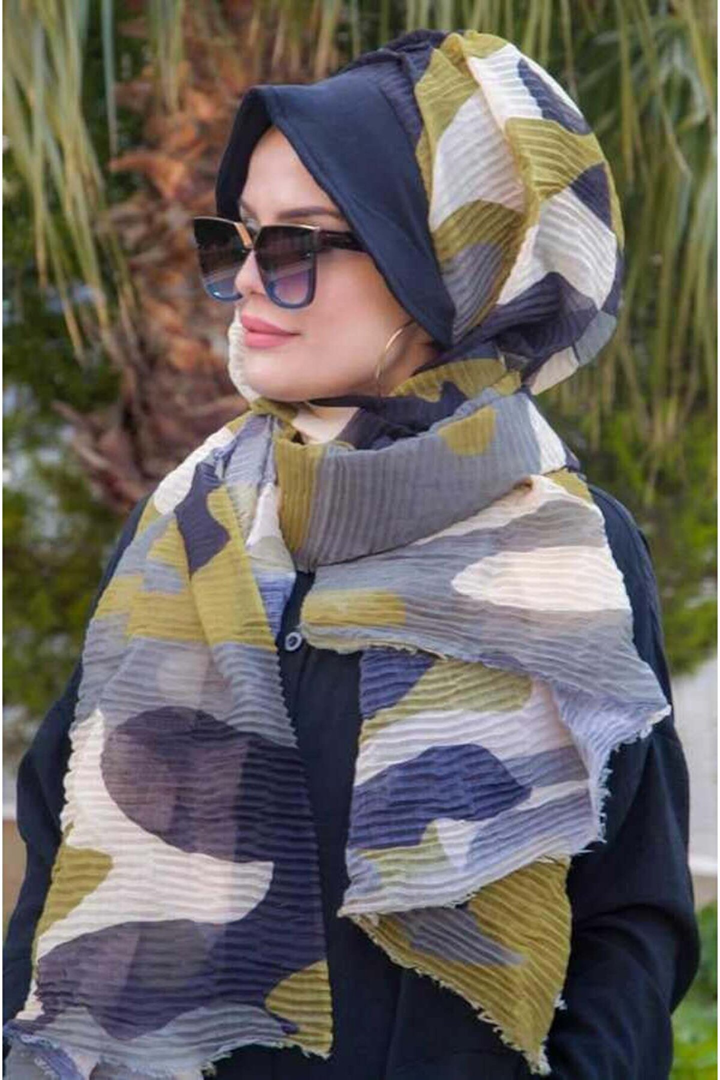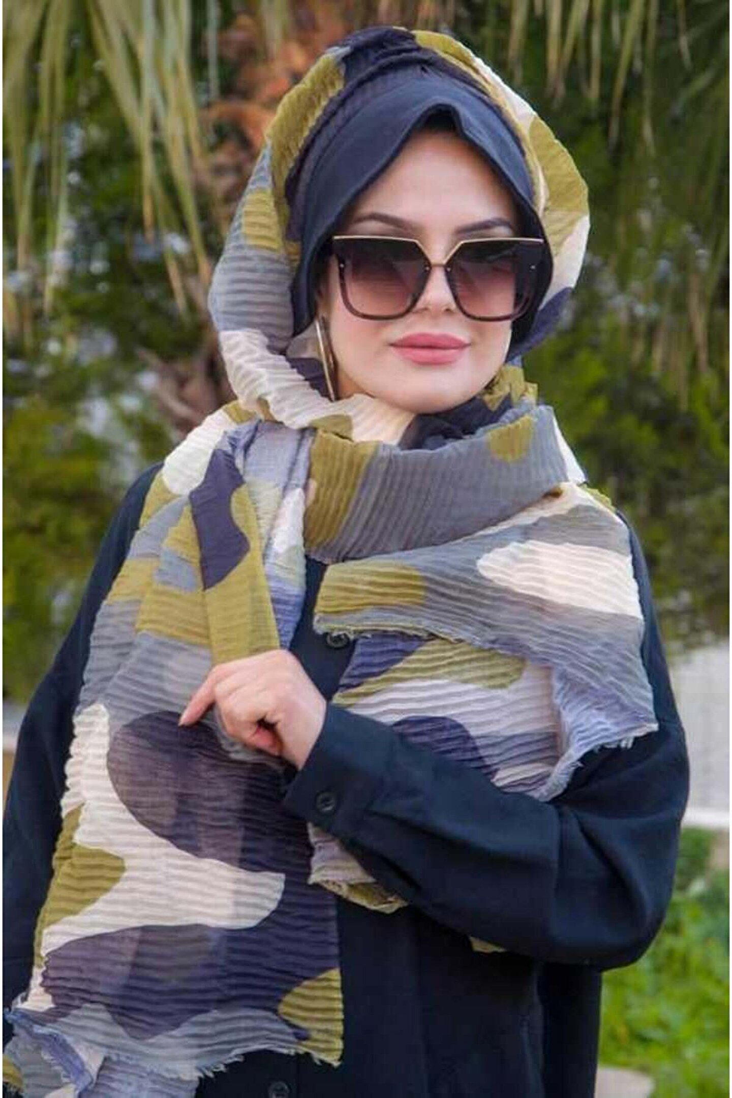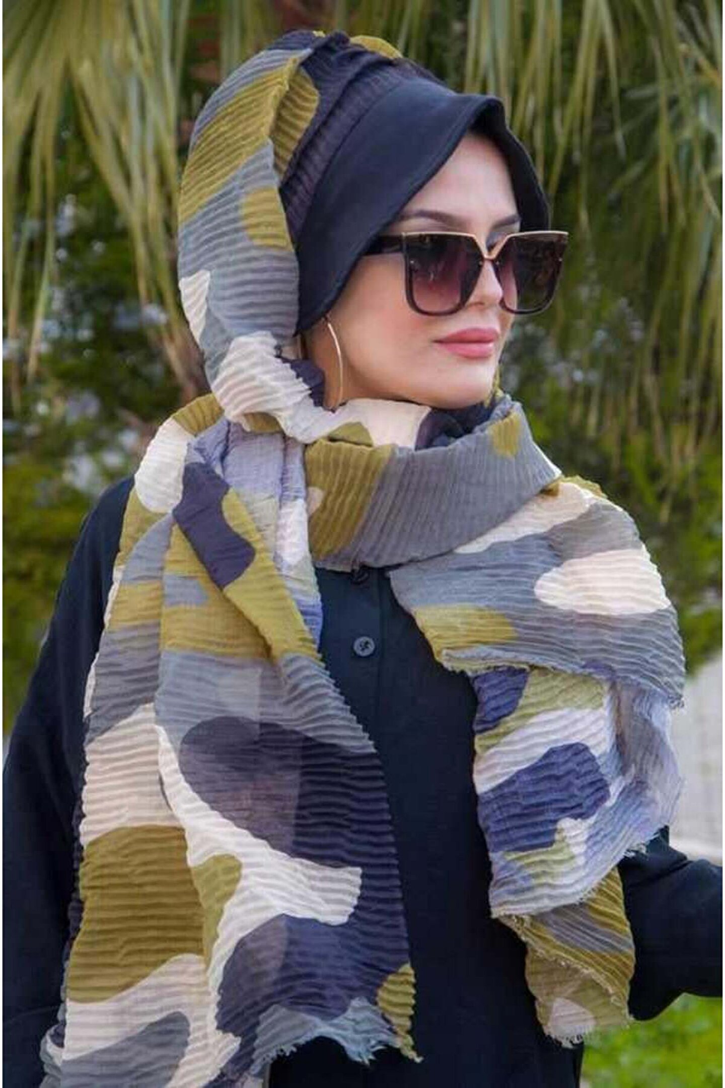 Aişe tesettür Siyah Haki Kamuflaj Pilise Şapkalı Şal