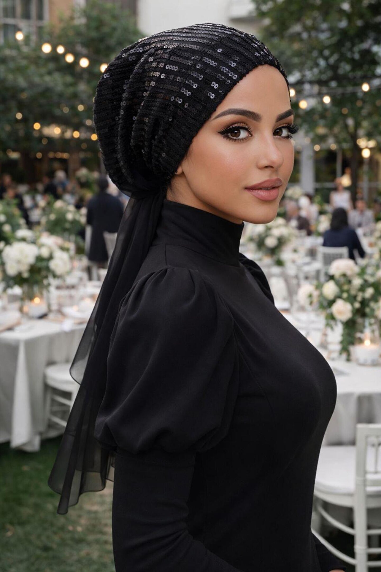 Aişe tesettür Siyah Payet Abiye Eşarp Bone