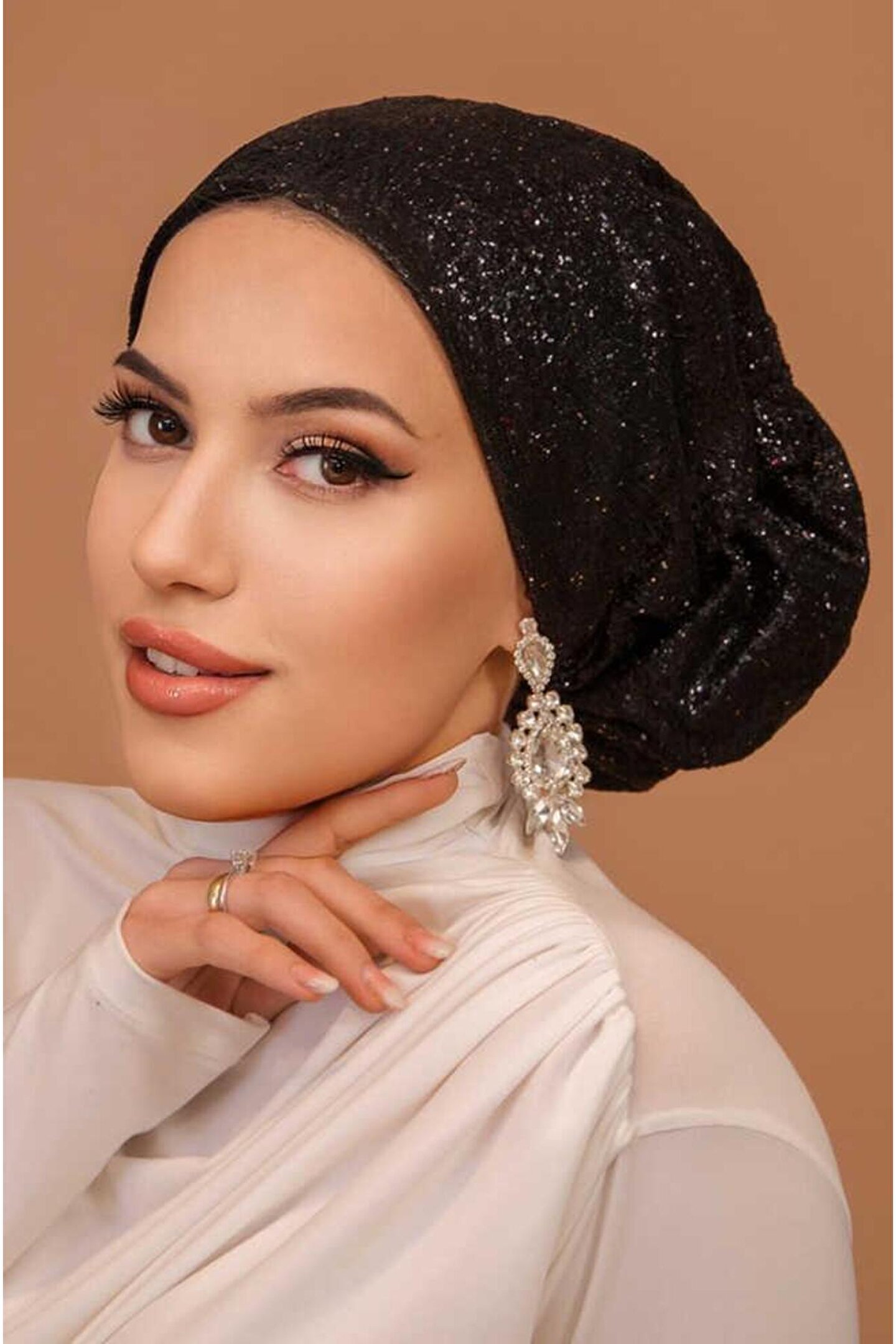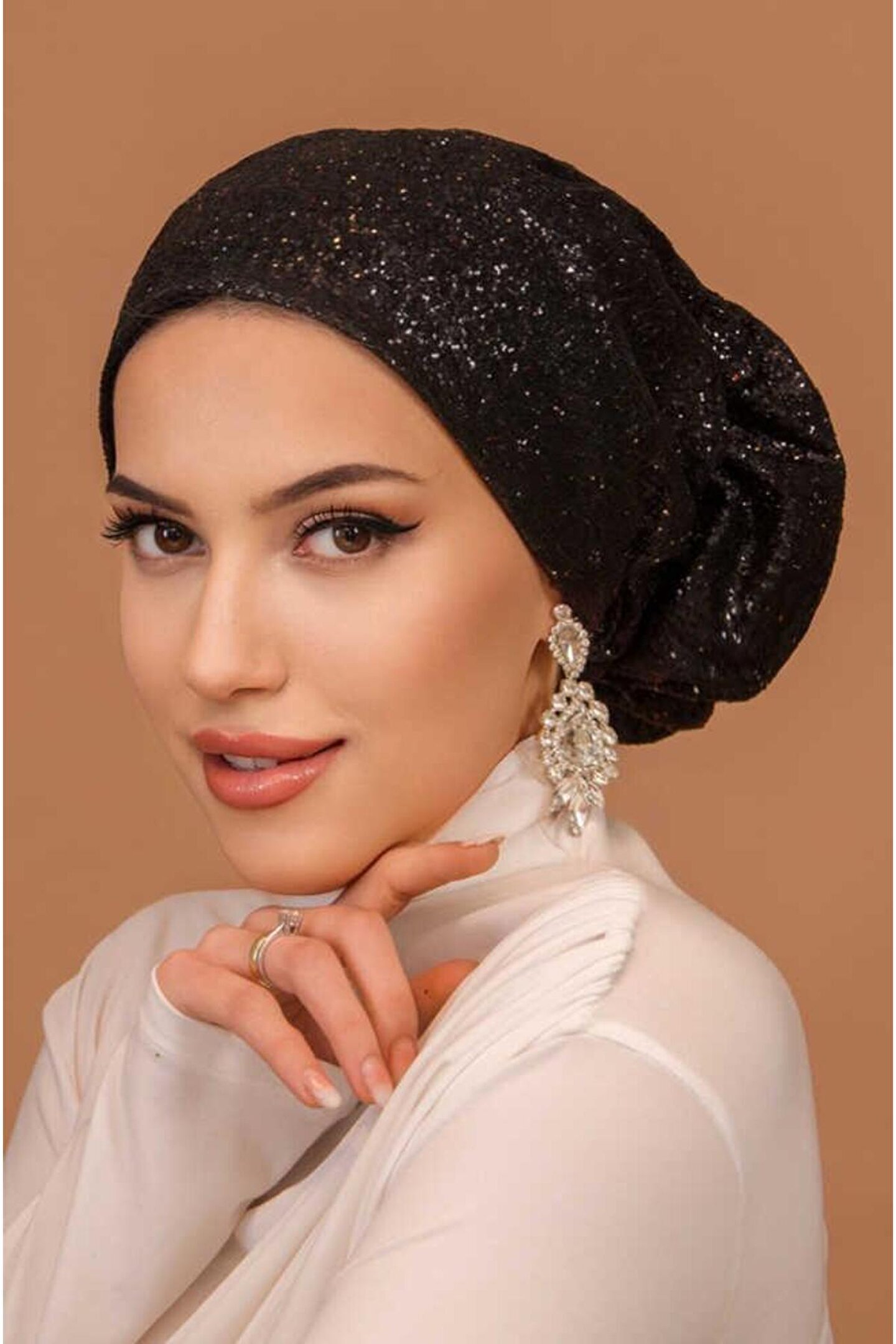 Aişe tesettür Siyah Simli Çağla Abiye Hazır Türban Bone