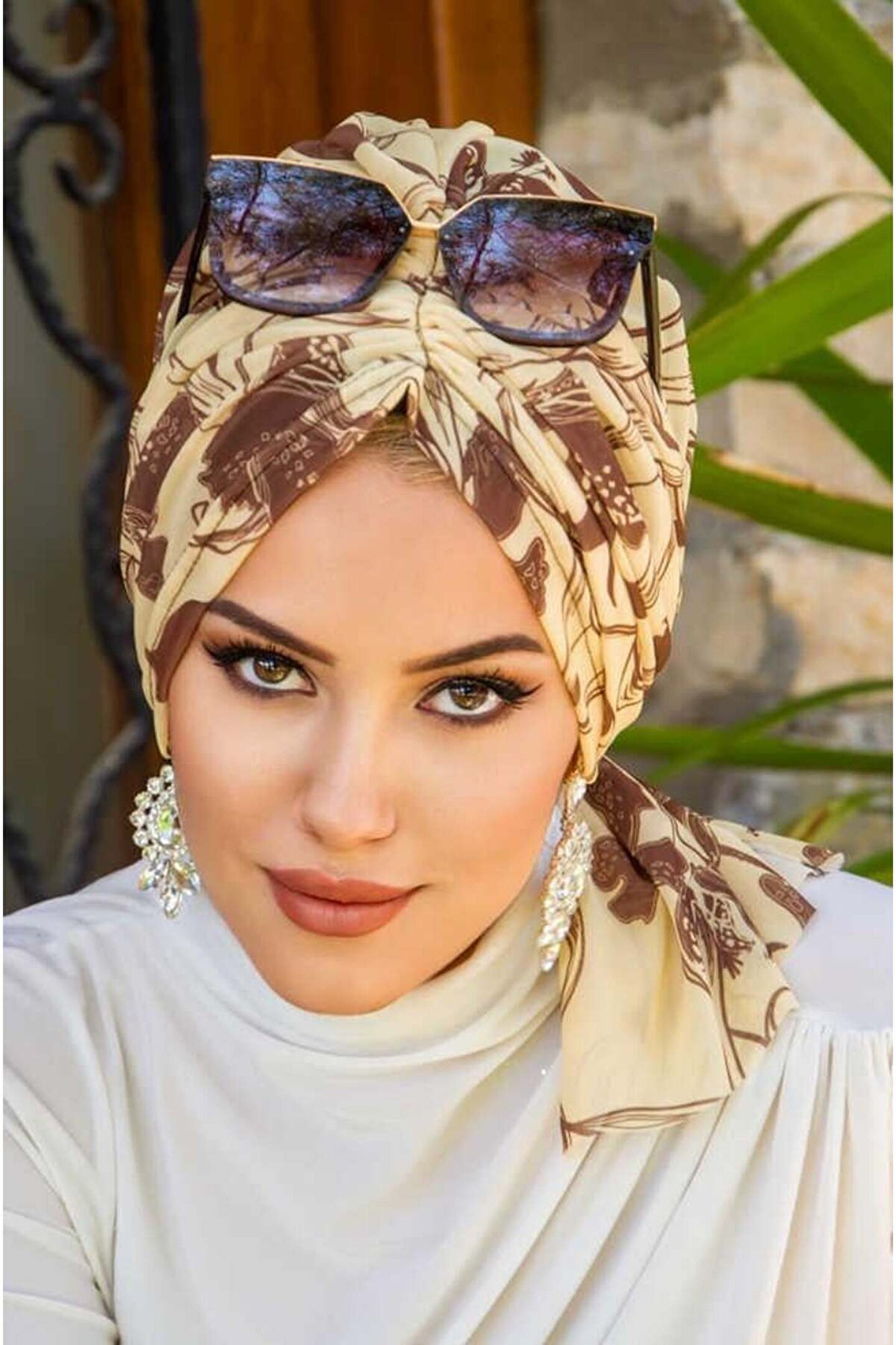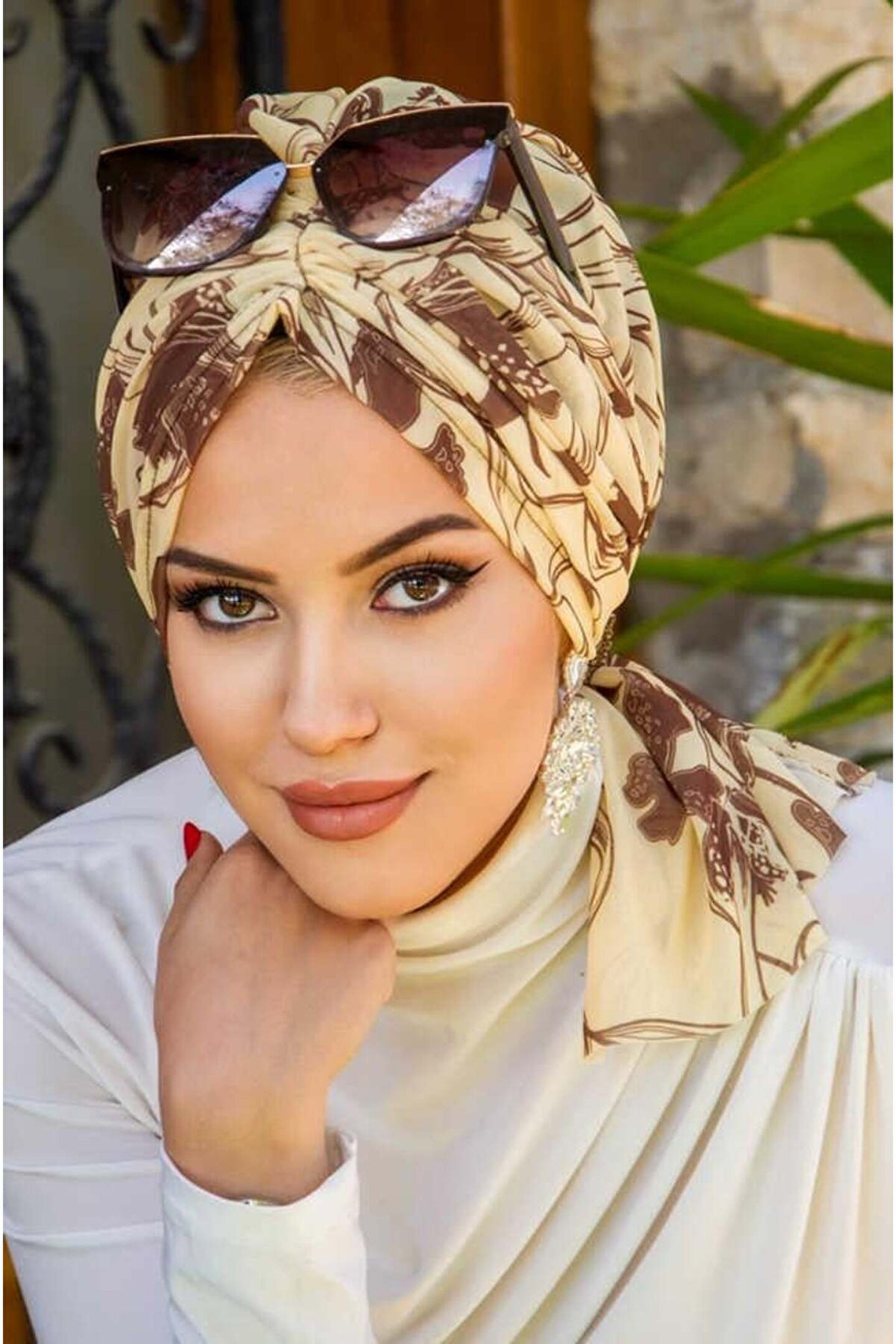 Aişe tesettür Uçuk Sarı Kahve Desen Tül Tokalı Bone