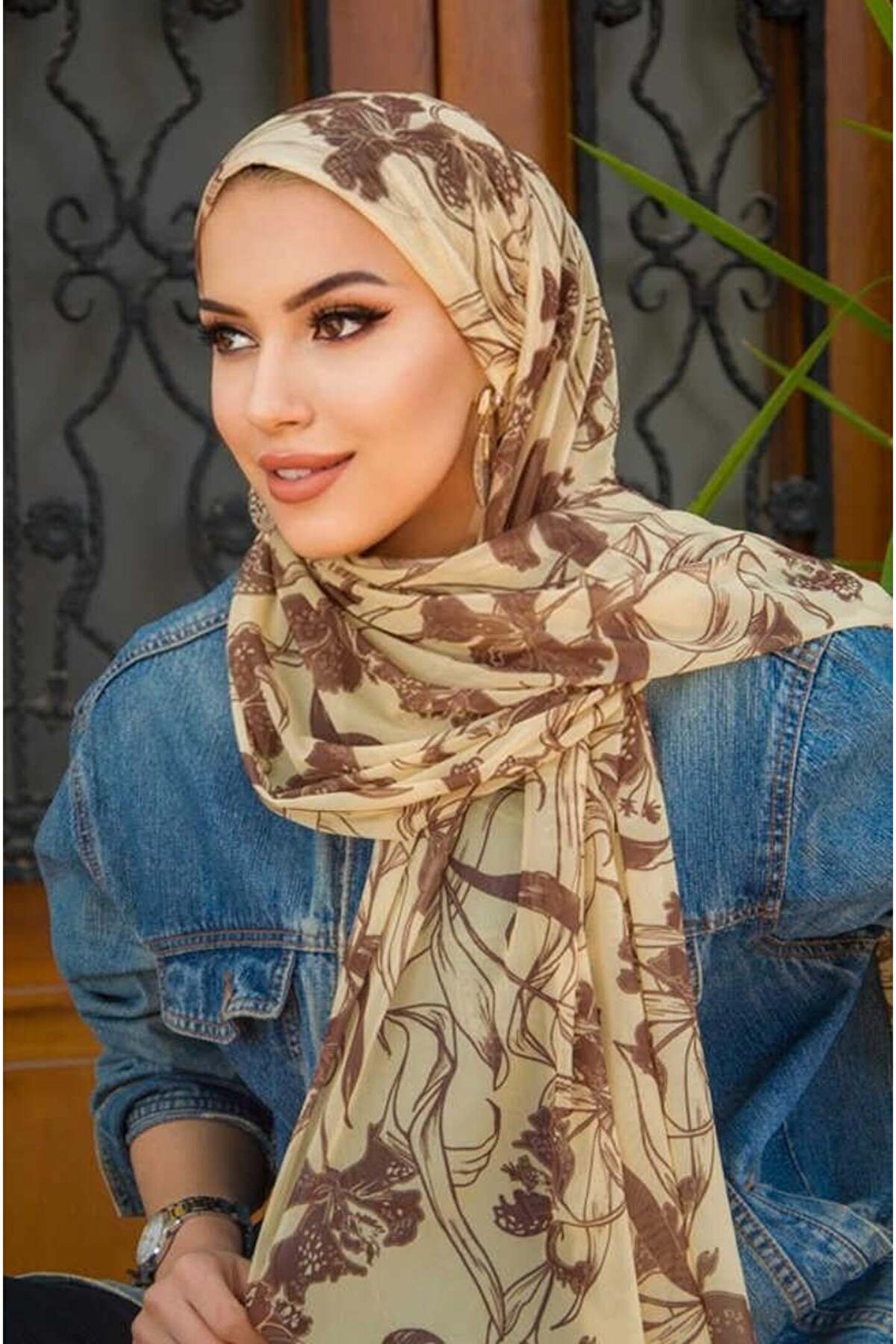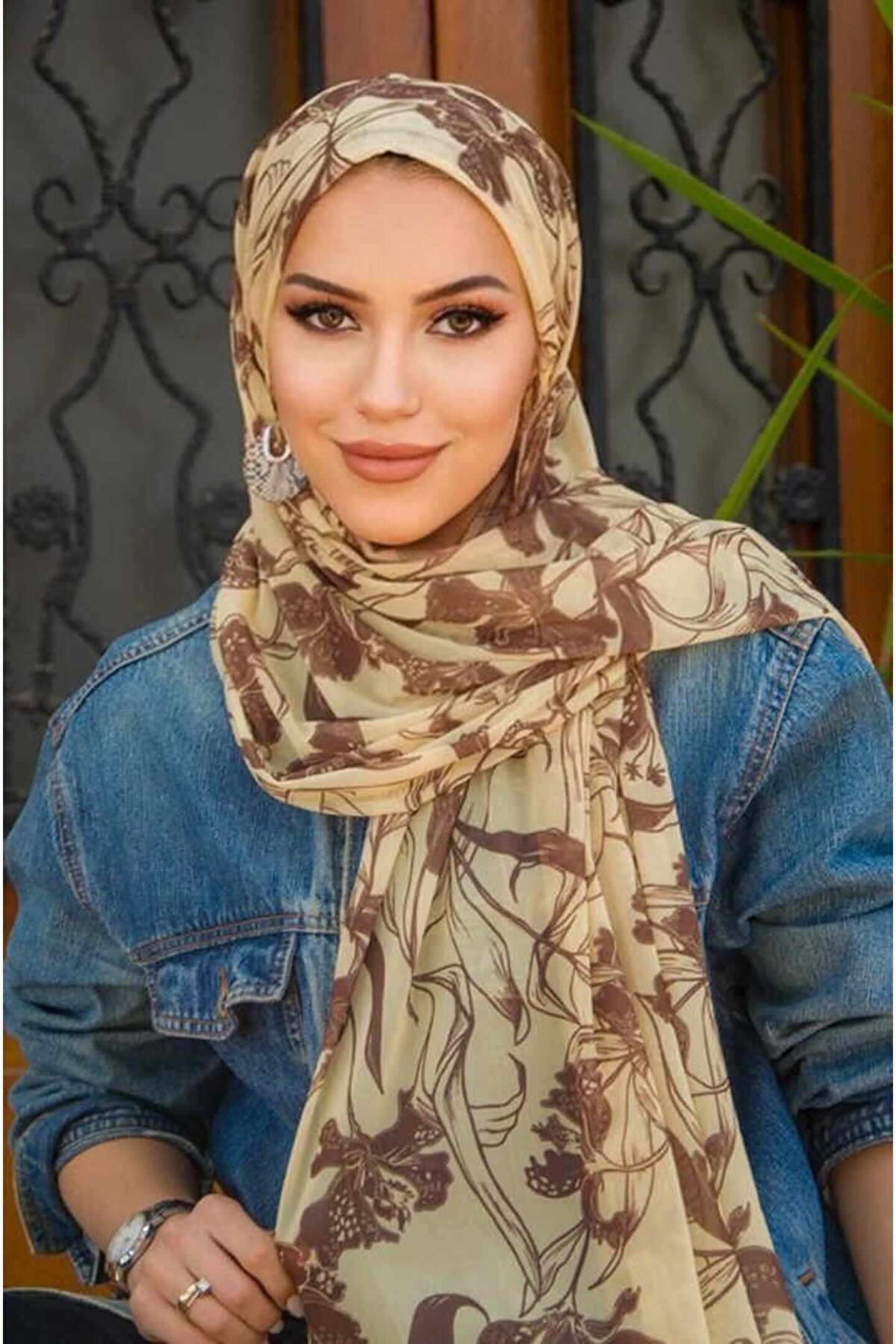 Aişe tesettür Uçuk Sarı Kahve Desenli Bone Hazır Şal