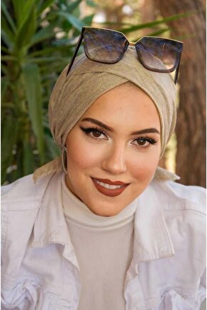 Aişe tesettür Vizon Bej Işıltılı Çapraz Bantlı Bone