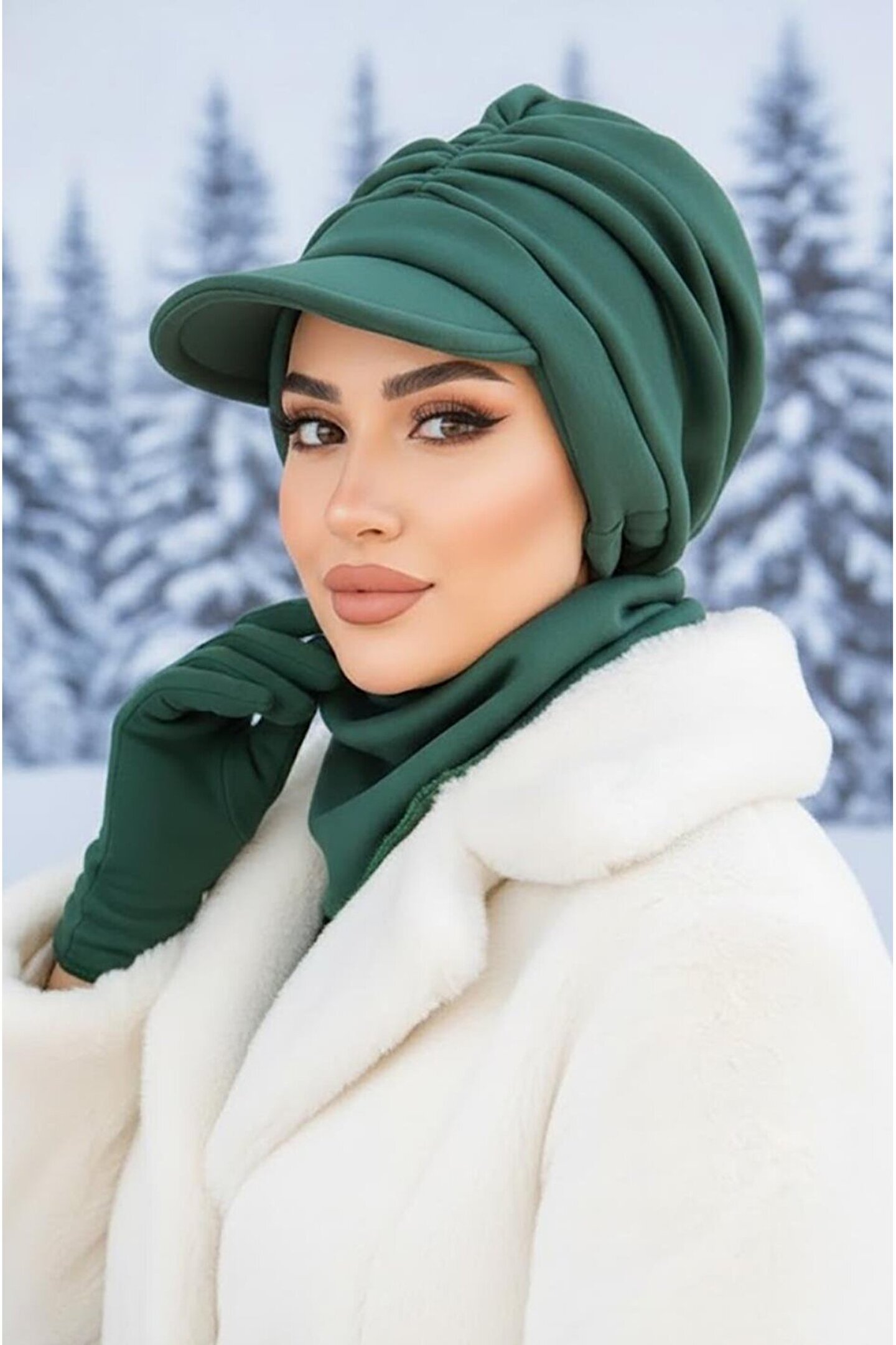 Aişe tesettür Zümrüt Kışlık Büzgülü Tesettür Şapka Ve Etol Takım