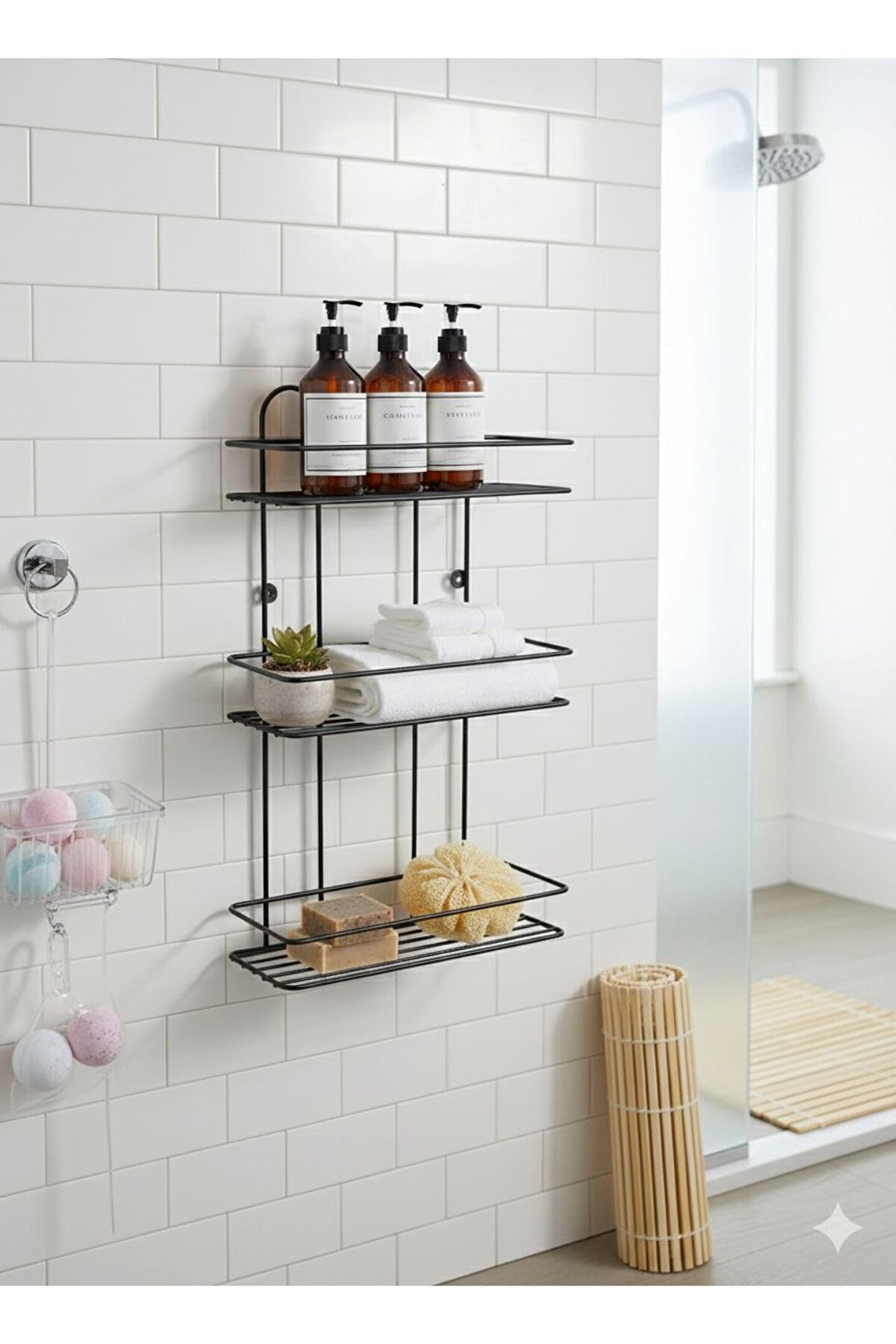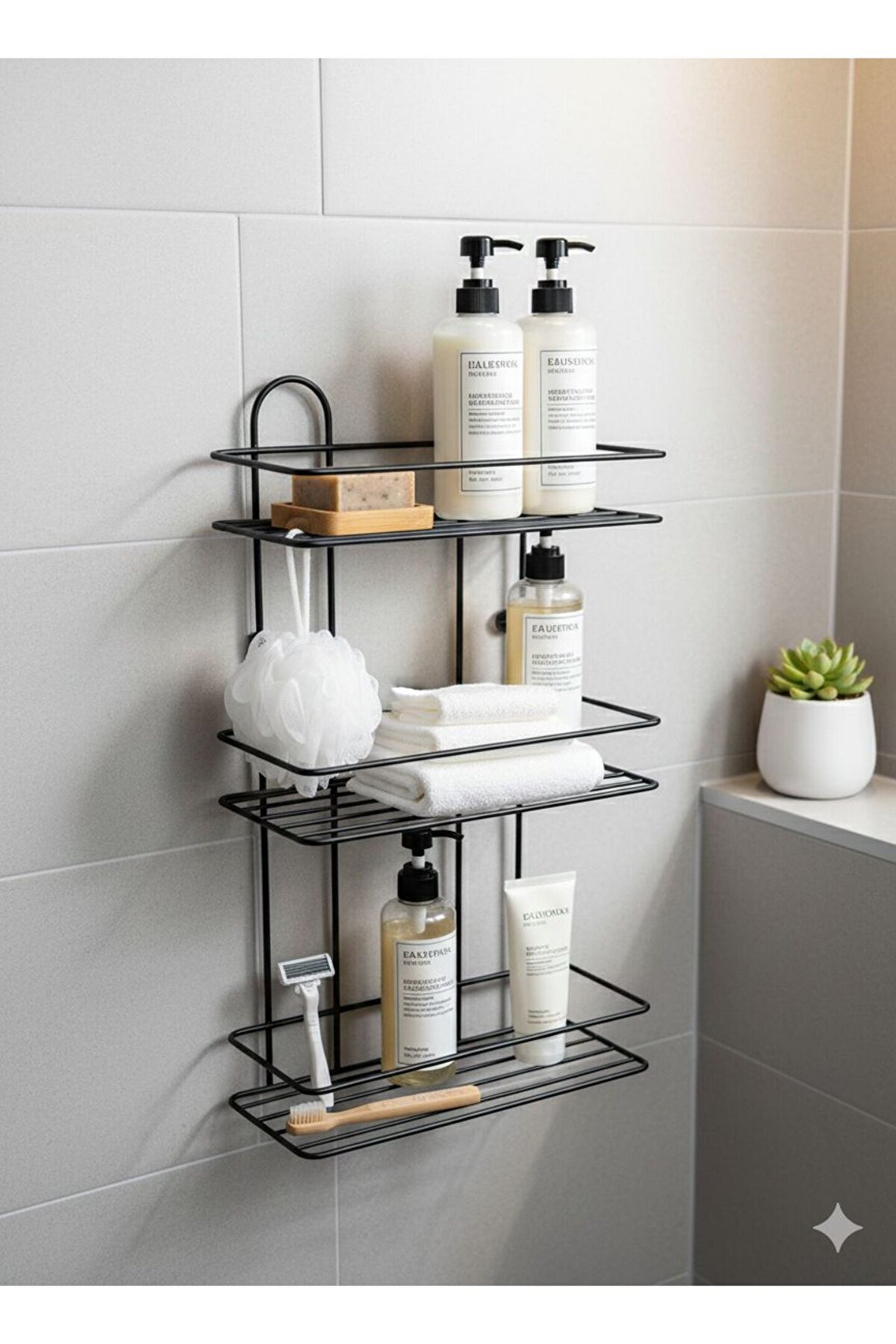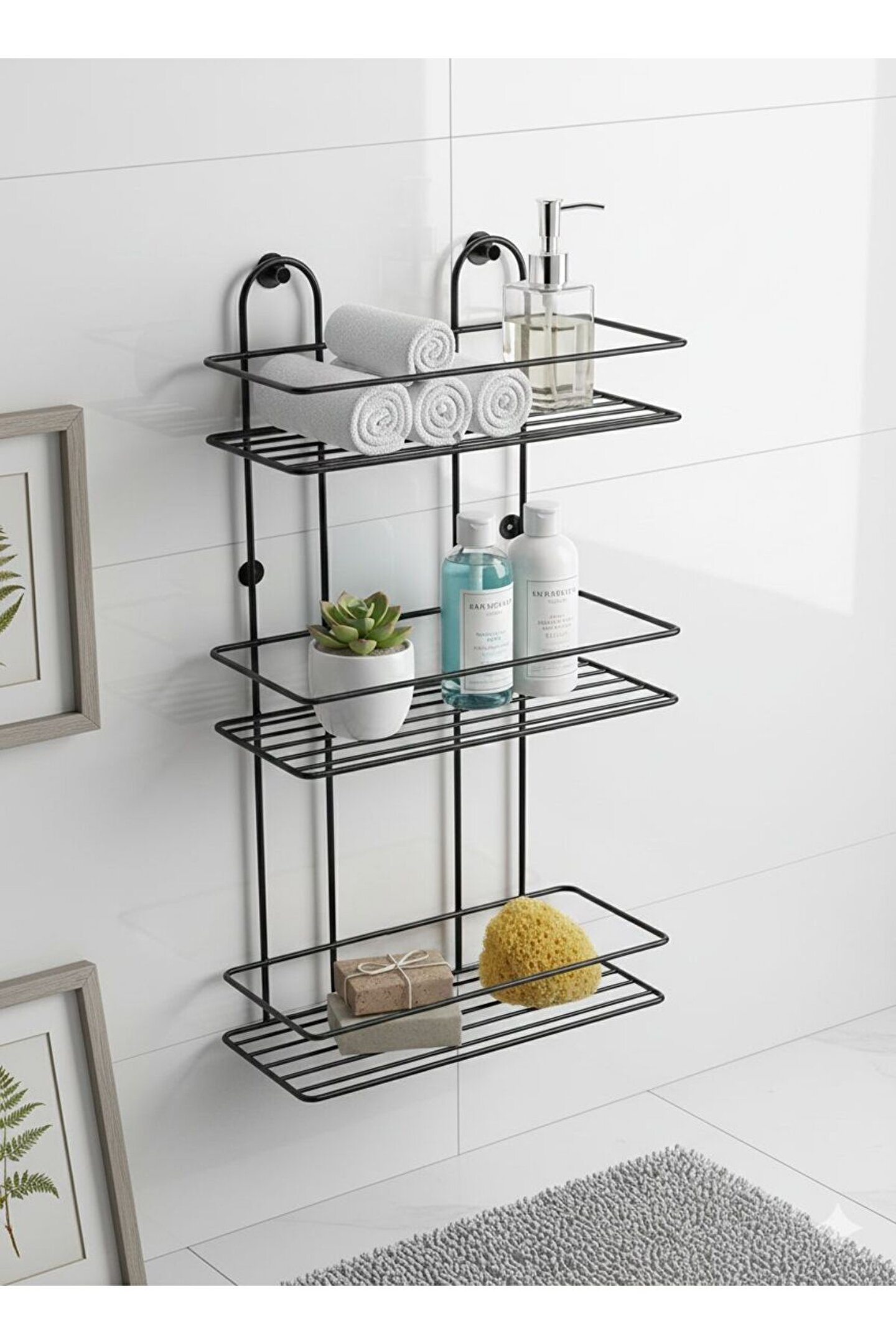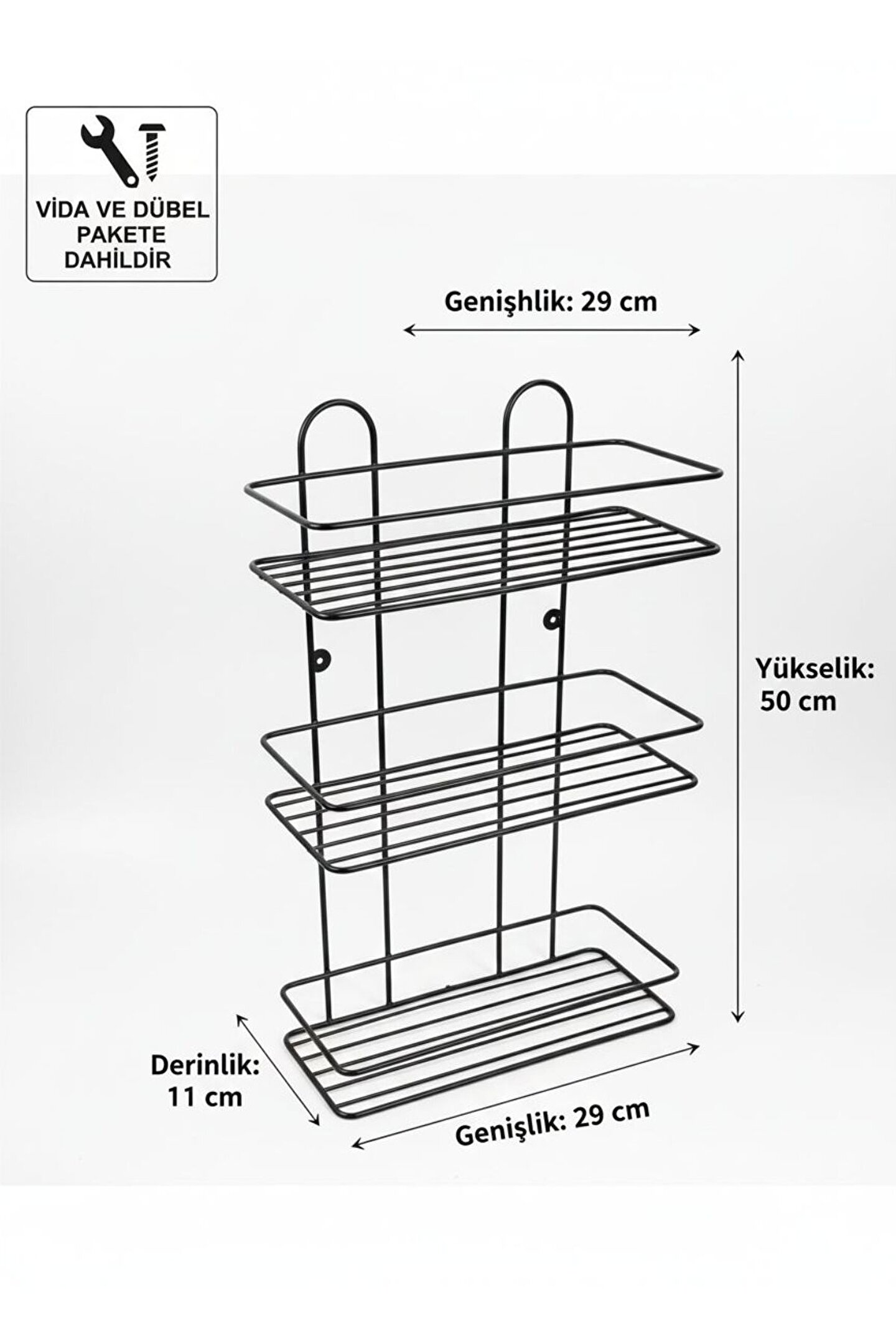 Evinizin Her Köşesine Düzen ve Şıklık Getirin! Minimalist tasarımı ve dayanıklı metal yapısıyla öne çıkan bu 3 katlı raf ünitesi, hem banyonuzda hem de mutfağınızda alan tasarrufu sağlar.; Mat siyah elektrostatik boyası sayesinde paslanmaya karşı dirençlidir ve uzun ömürlü kullanım sunar.; Ürün Özellikleri: * Malzeme: Yüksek kaliteli profil metal (Paslanmaya dayanıklı fırın boya).; * Tasarım: Modern endüstriyel çizgilerle her türlü dekorasyona uyum sağlar.; * Kullanım Alanı: Banyo (şampuanlık, havluluk), Mutfak (baharatlık, yağlık) veya Antre (anahtarlık, dekoratif objeler).; * Montaj: Arka kısmında yer alan iki adet montaj deliği sayesinde duvara kolayca sabitlenebilir.; Teknik Ölçüler: * Yükseklik (Boy): 50 cm * Genişlik (En): 29 cm * Derinlik: 11 cm * Raf Sayısı: 3 Katlı İster Vidalı İster Yapışkanlı Kullanabilirsiniz.; * Delme İşlemine Son: Duvarlarınızı delmeden, çivi kullanmadan saniyeler içinde montaj yapmanızı sağlar.; * Yüksek Taşıma Kapasitesi: Özel yapışkan yüzeyi sayesinde mutfak gereçleri, banyo aksesuarları ve dekoratif eşyalar için ekstra dayanıklıdır.; * Şeffaf ve Estetik Tasarım: Şeffaf yapısı sayesinde uygulandığı yüzeyde görüntü kirliliği yaratmaz, her dekorasyona uyum sağlar.; * Suya ve Neme Dayanıklı: Banyo ve mutfak gibi nemli alanlarda güvenle kullanılabilir, yapışkanlığını yitirmez.; * Çok Yönlü Kullanım: Fayans, cam, metal, ahşap ve PVC gibi pürüzsüz tüm yüzeylere mükemmel tutunur.; Ürün İçerisinde 2 adet yapışkanı 2 adet vidası 2 adet dübeli beraber gelmektedir.